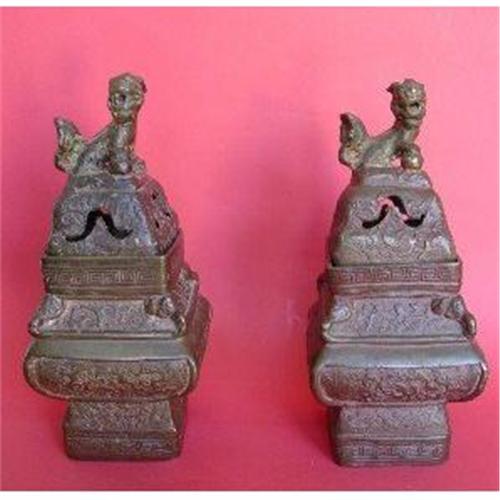 Roughly made hard metal, possibly bronze, foo lions on the removable tops of incense burners. Elephant heads and other carvings decorate the 4 sides of the bottom. <p> Age: 19th Century <p> Country of Origin: China <p> Measurements: Approximately 10" in height with a base dimension of 4 3/4" square at the largest point