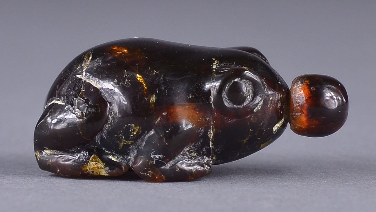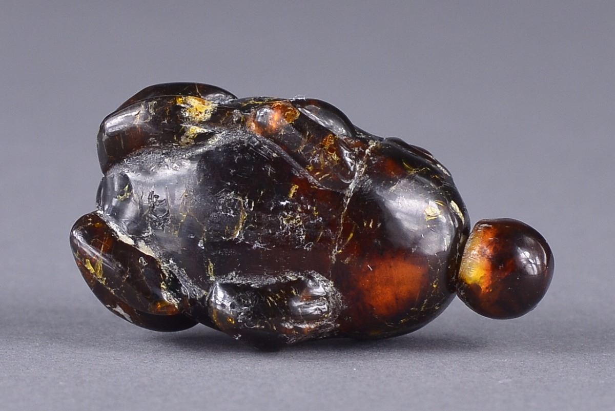 19th Century Chinese carved amber snuff bottle; the body in form of frog; L: 5 cm, 10 grams