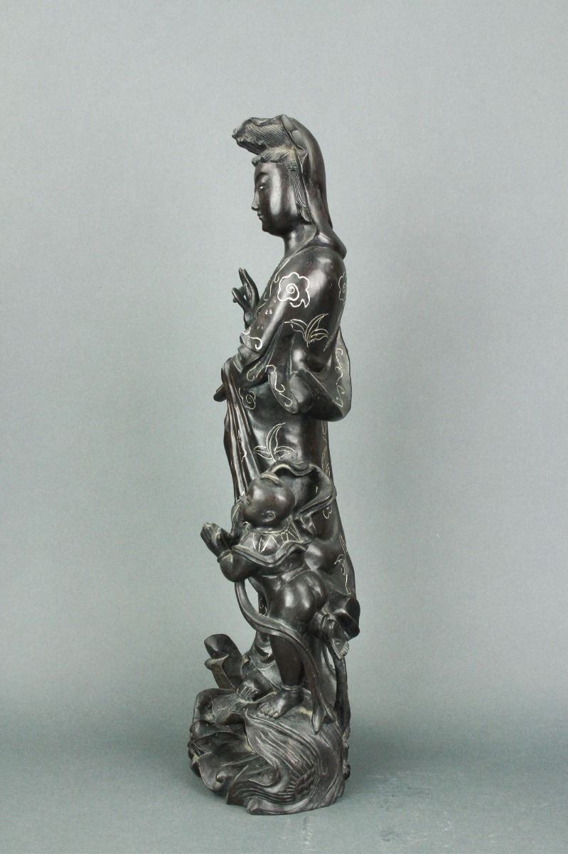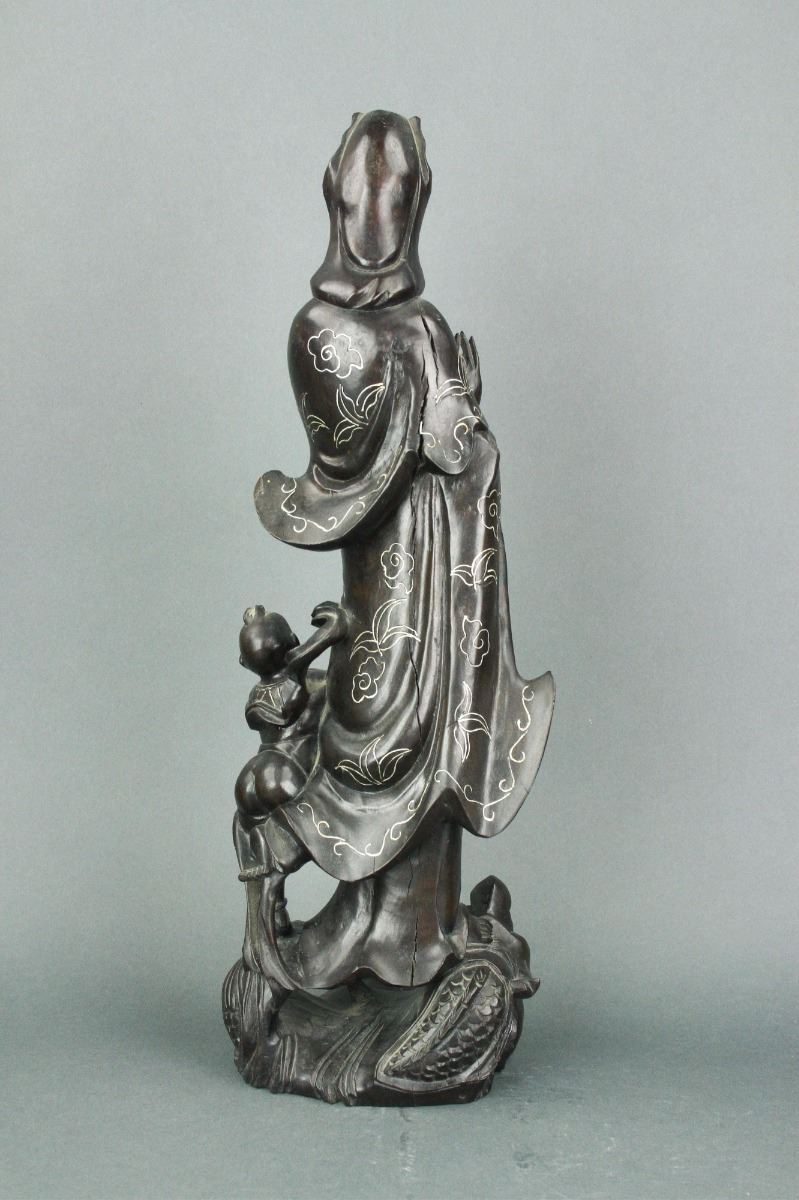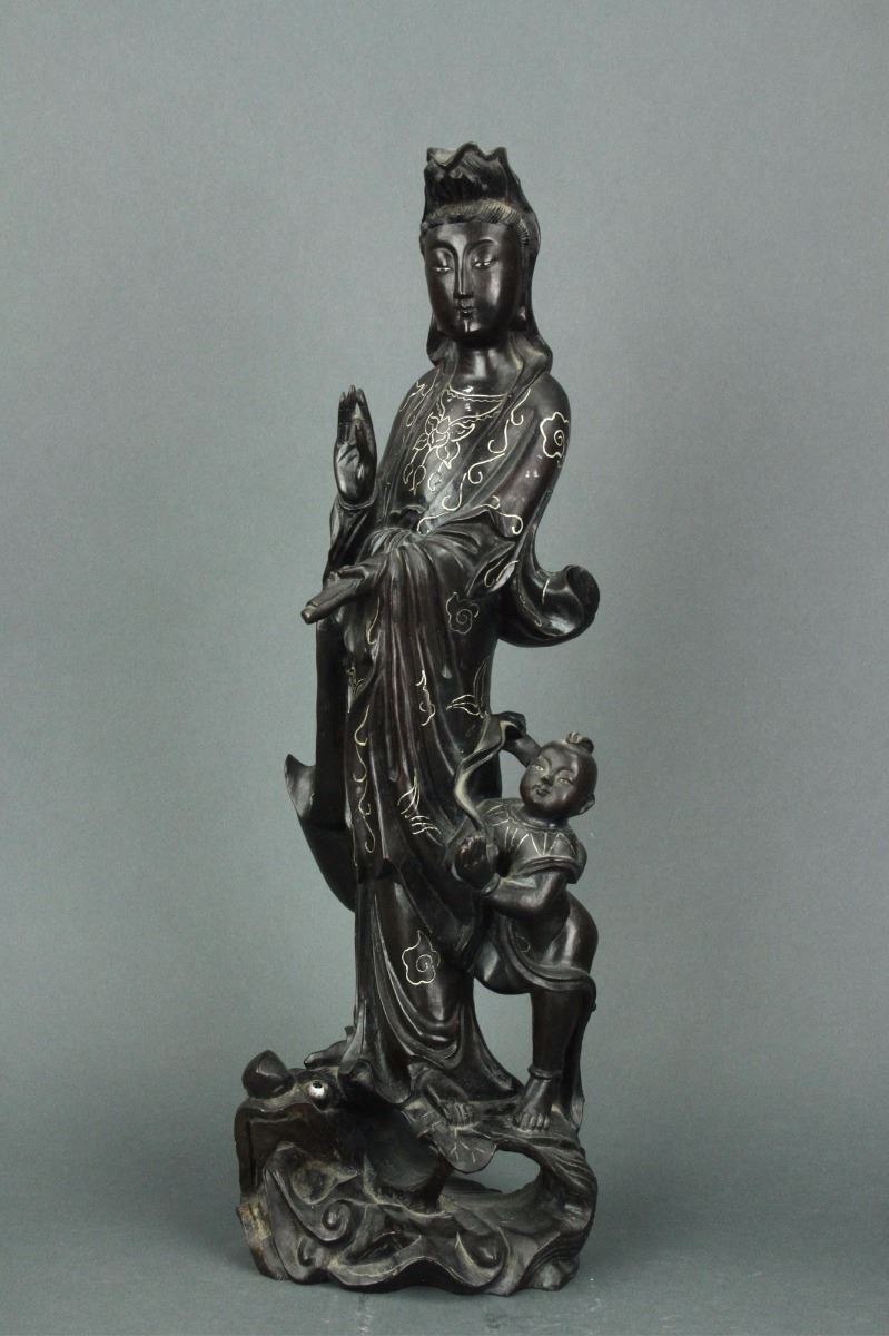 Chinese carved wood figure group: featuring Guanyin standing alongside boy and atop lotus petal and dragon with inset eyes in openwork design; the figural group decorated with inlaid silver wire design; H: 47 cm, W: 15 cm