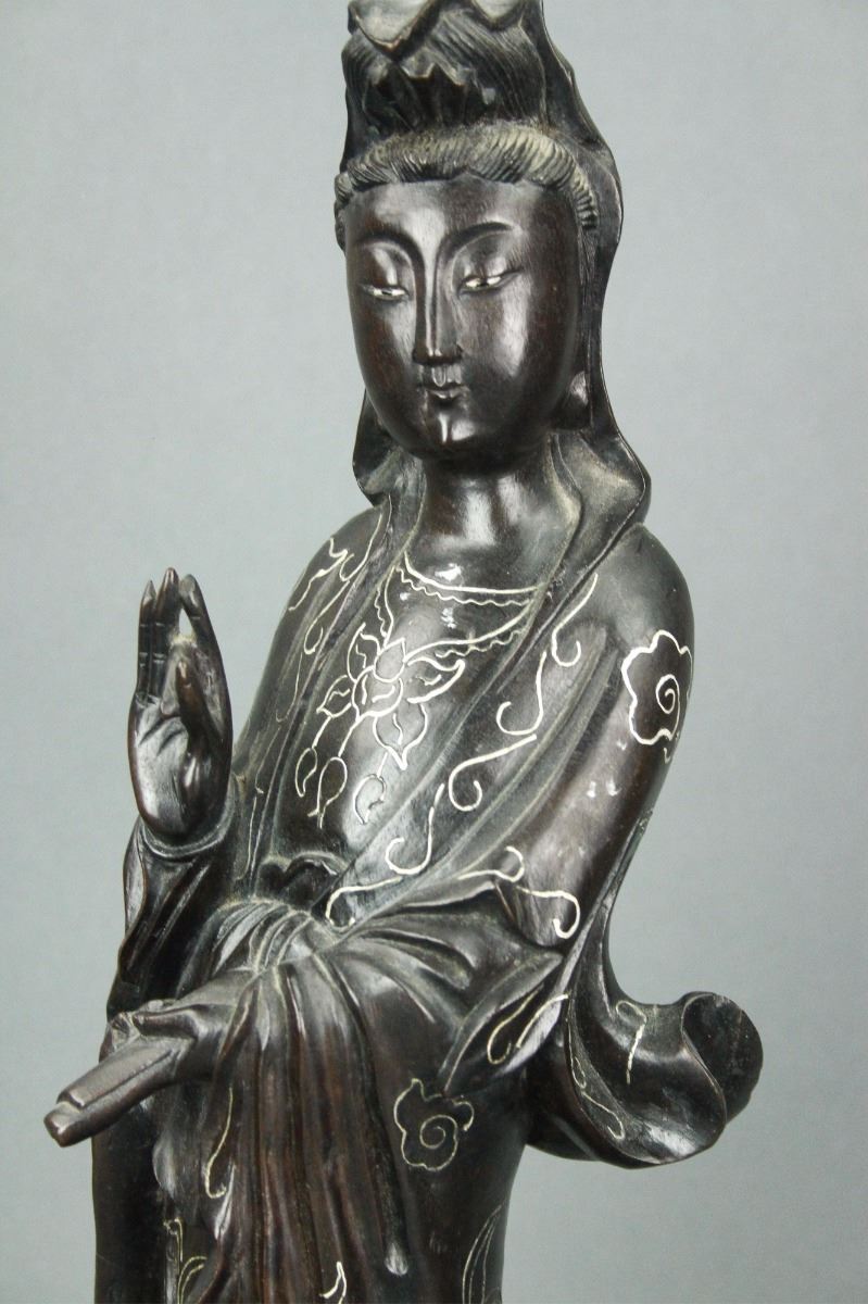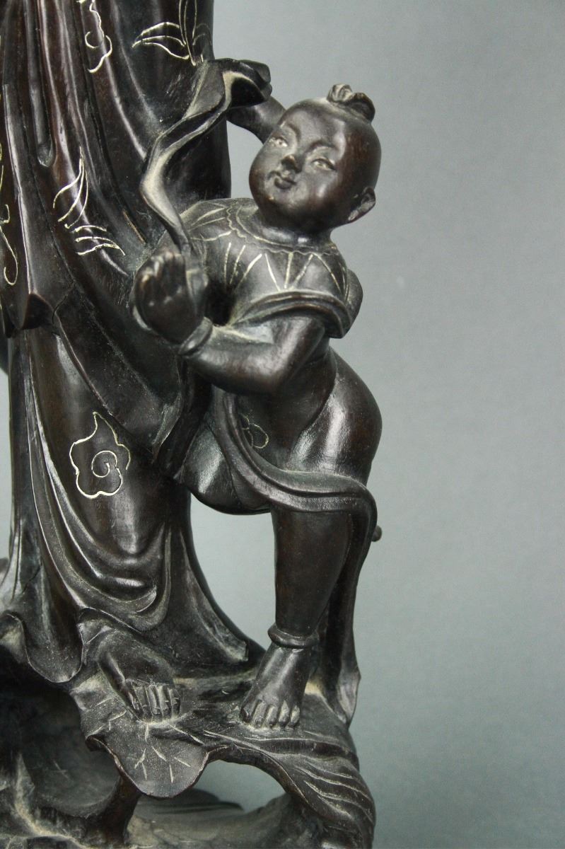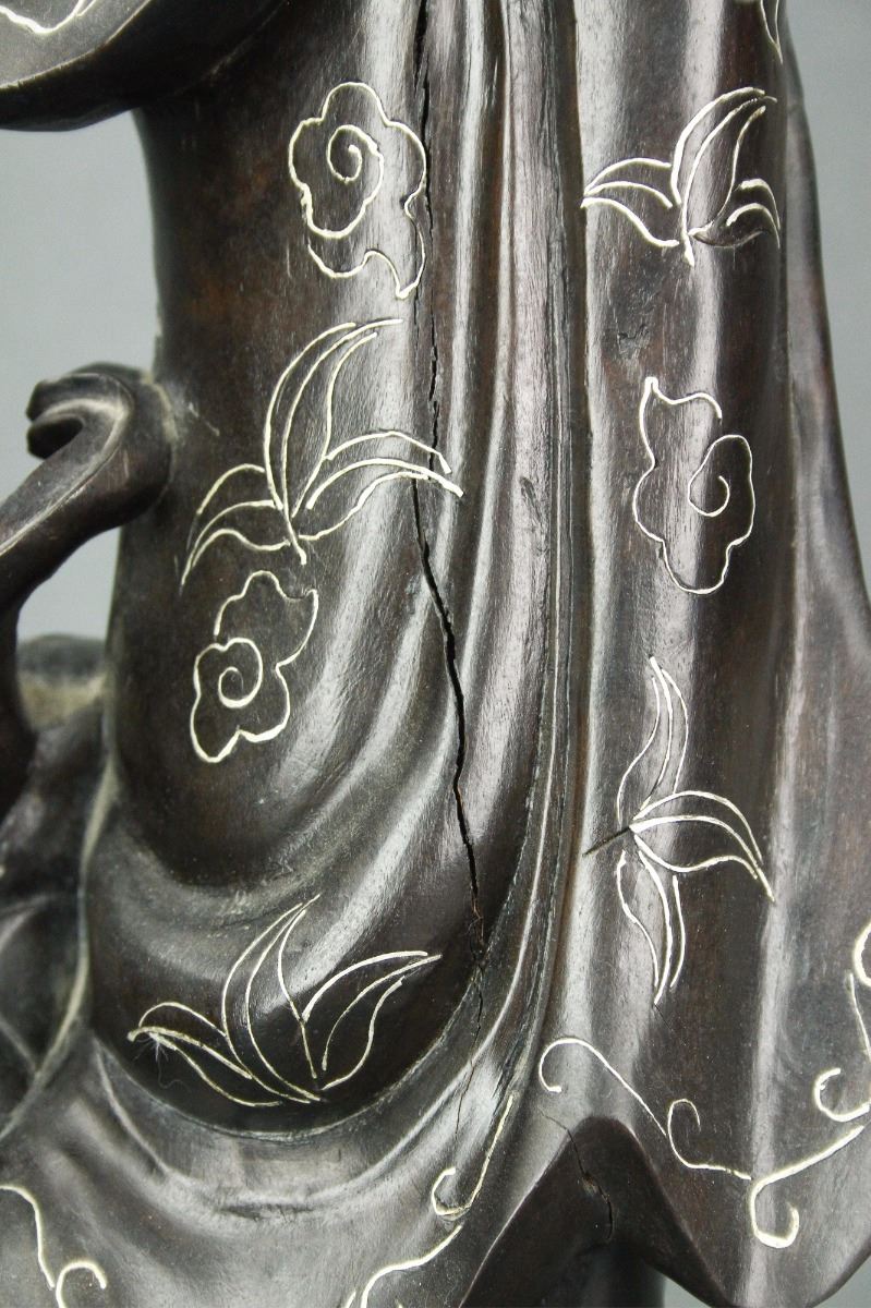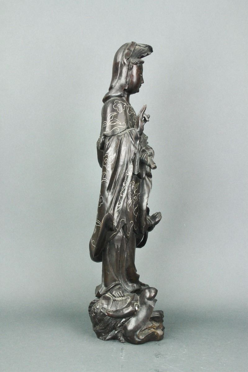 Chinese carved wood figure group: featuring Guanyin standing alongside boy and atop lotus petal and dragon with inset eyes in openwork design; the figural group decorated with inlaid silver wire design; H: 47 cm, W: 15 cm