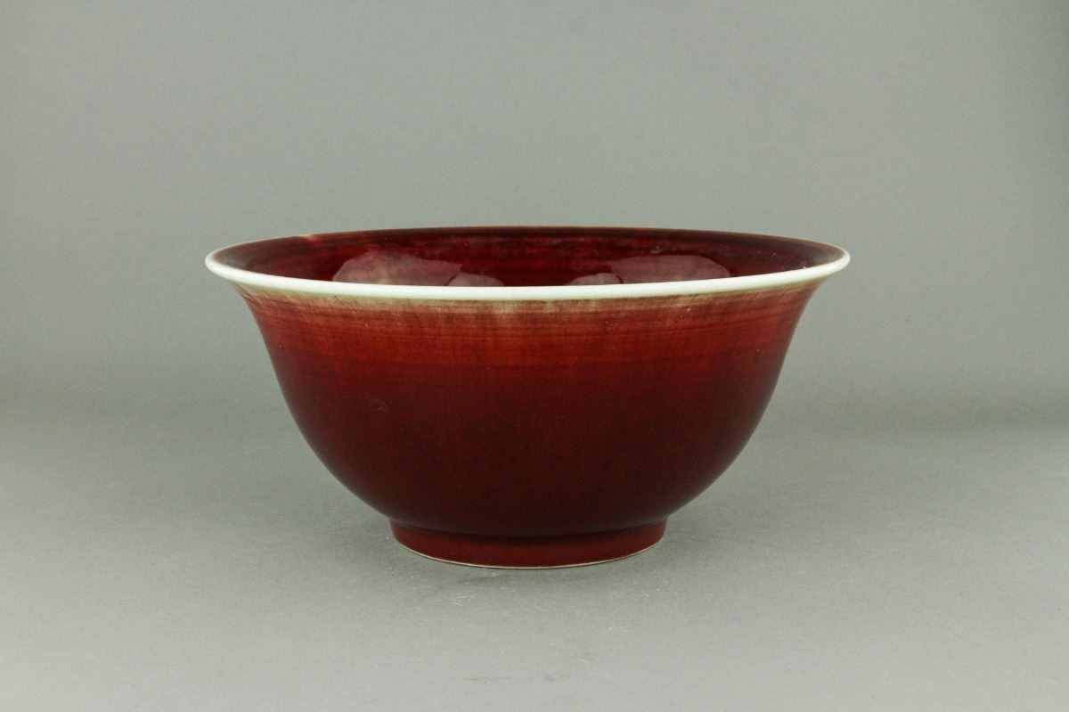 Chinese copper red glazed porcelain bowl; 19th century; of deep rounded sides with flaring rim; H: 12 cm, D: 26.5 cm, 2395 grams