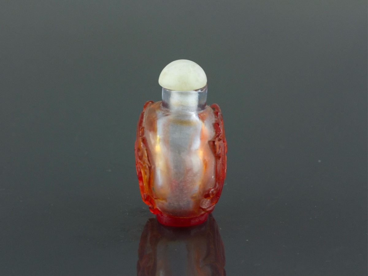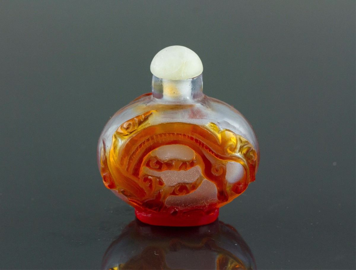 Chinese Peking glass snuff bottle; 19th century; carved with coiling dragon in relief; H: 5 cm, L:5 cm, 59 grams