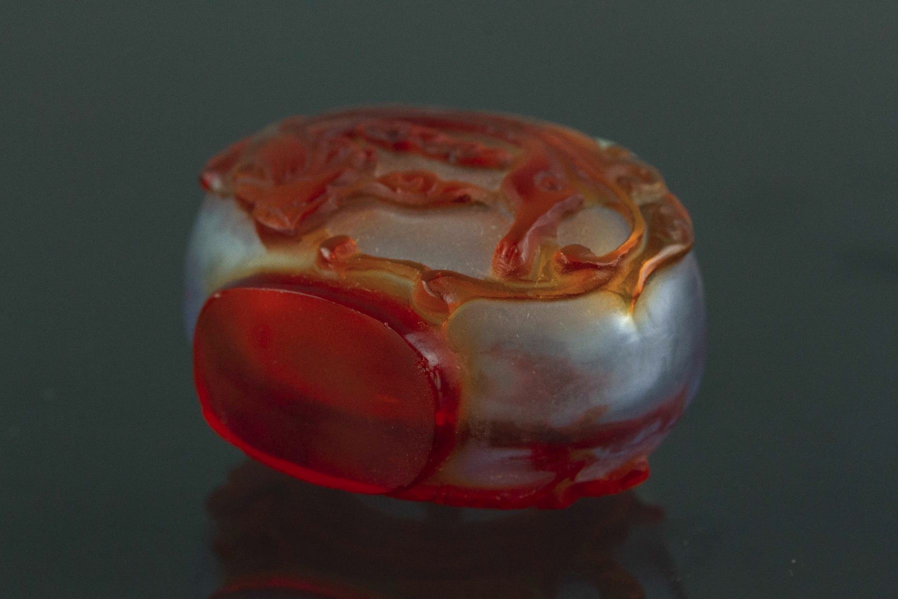 Chinese Peking glass snuff bottle; 19th century; carved with coiling dragon in relief; H: 5 cm, L:5 cm, 59 grams