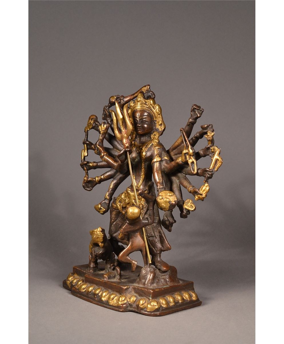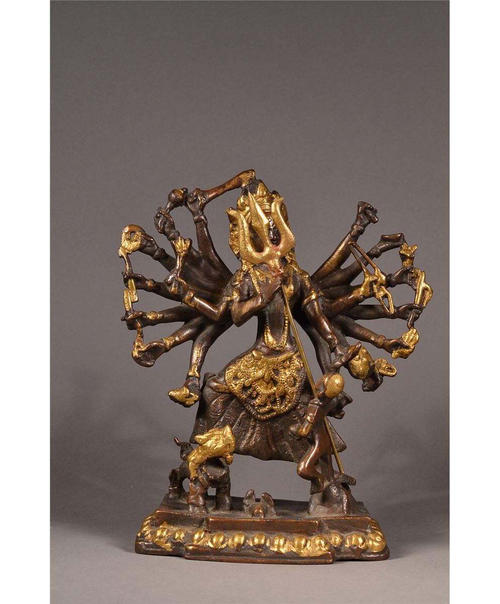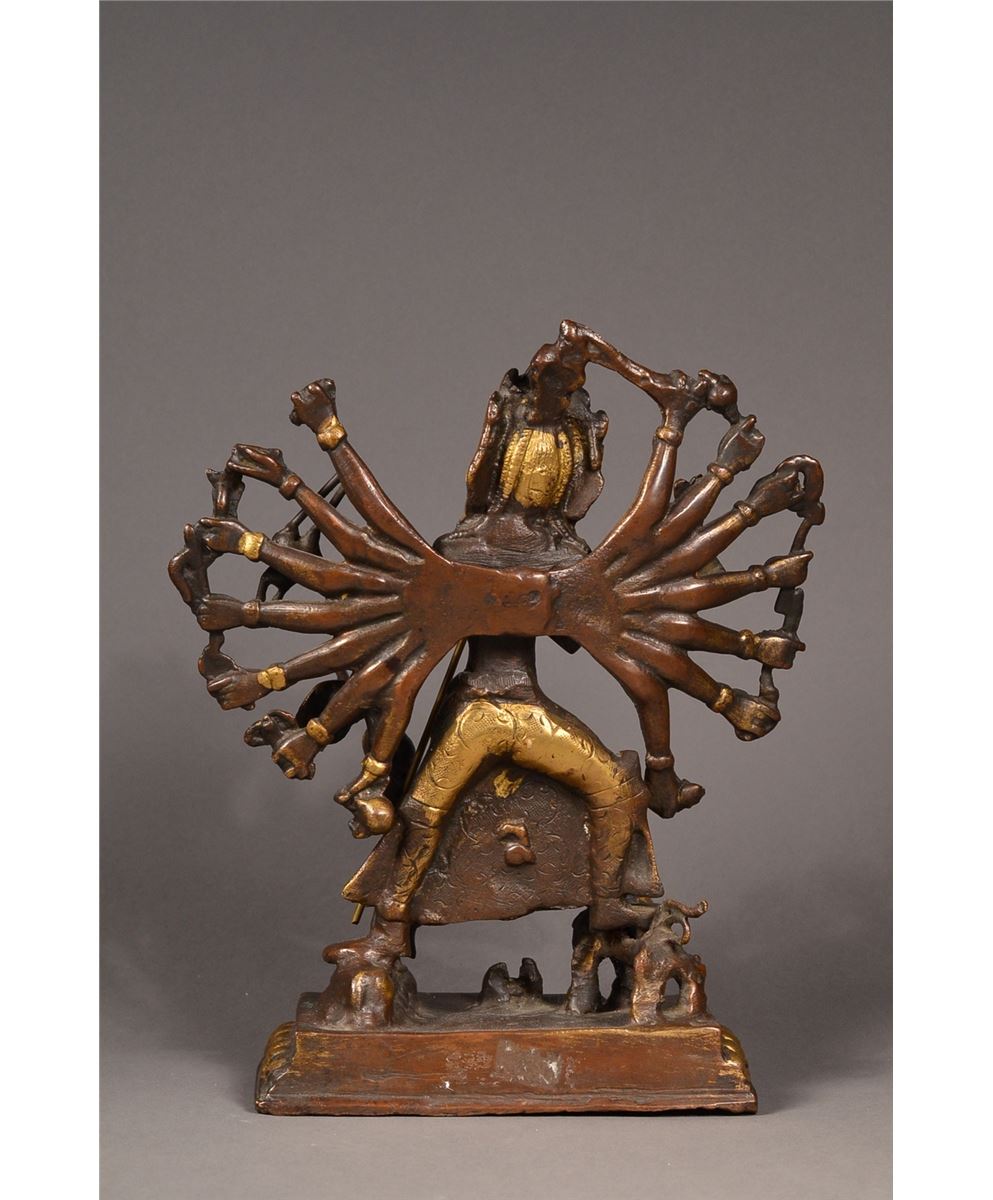 19th Century Chinese gilt bronze figure of Harihara standing in alidhasana on Garuda and Nandi, holding a large trident, bow, sword, and conch in his radiating arms; H: 25.5 cm, W: 20.25 cm, 9 cm, 3068 grams
