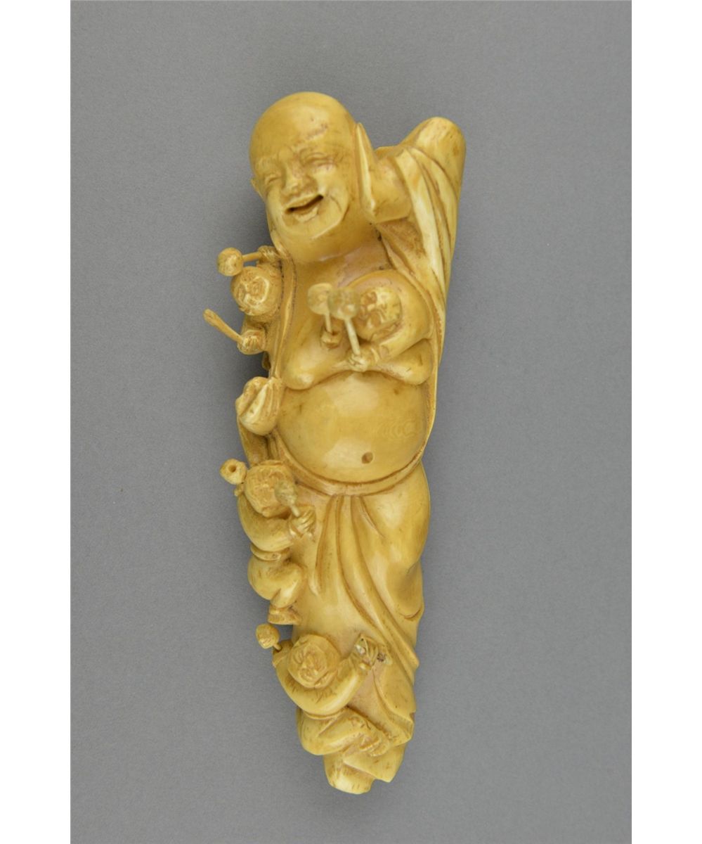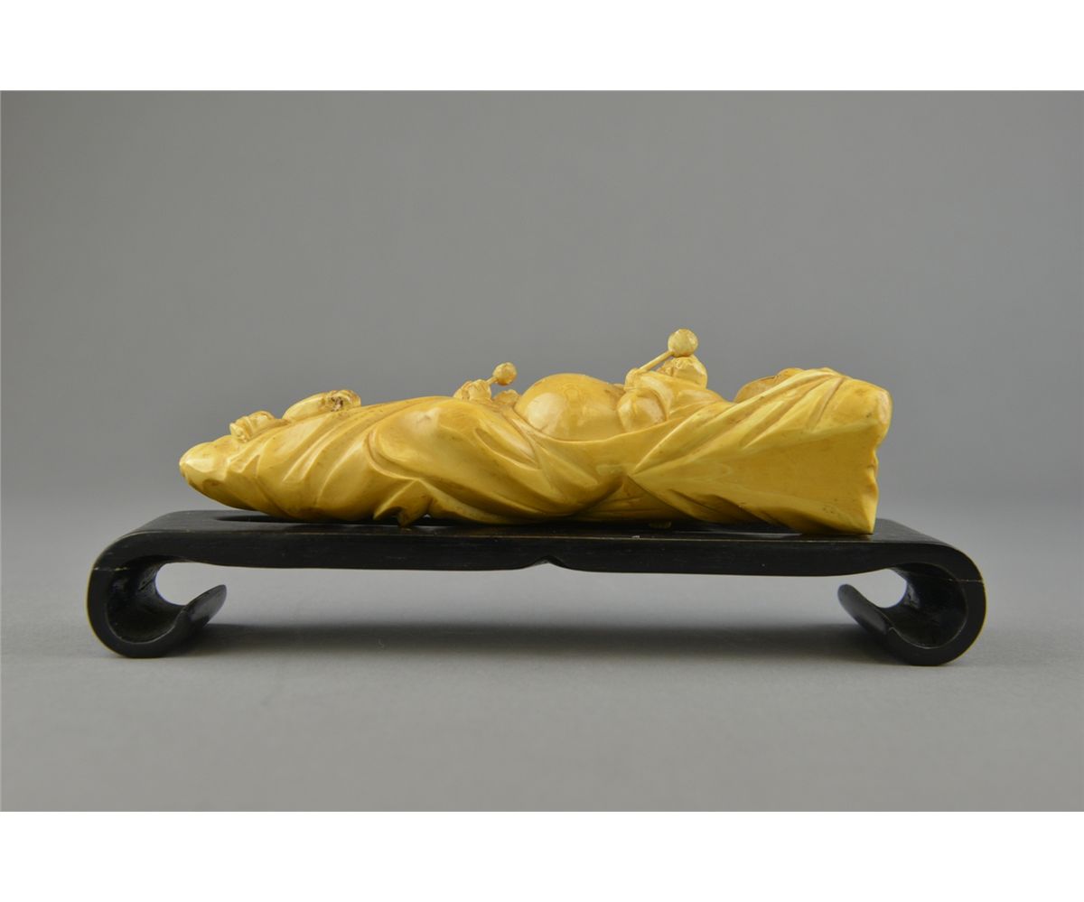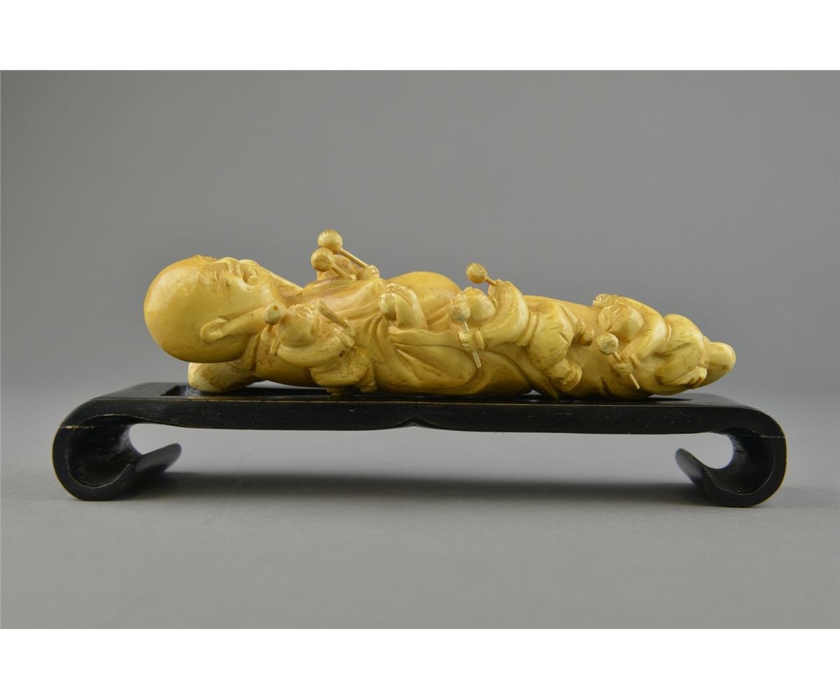 Finely carved 19th Century Chinese ivory figure; featuring reclining Buddha with small children holding Buddhist instruments (small broken piece); L: 17 cm, 256 grams, wood stand; Provenance: Liao Collection Vancouver