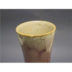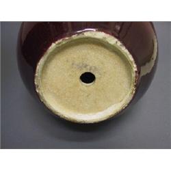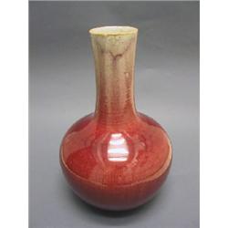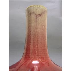 Of ovoid form rising to a tall slightly flared neck covered with a glaze the color of crushed strawberries over an oatmeal crackle which thins to warm oatmeal color beneath the mouth rim. The base has been drilled. China, 19th C. 14 3/4' ( 37.5 cm) H.