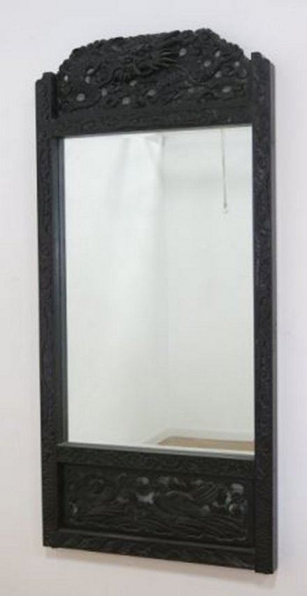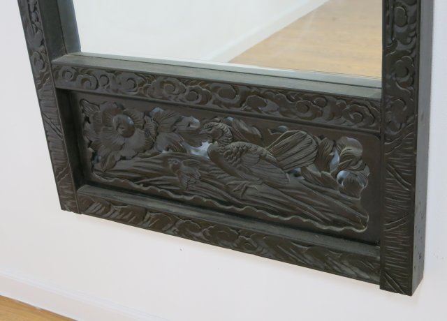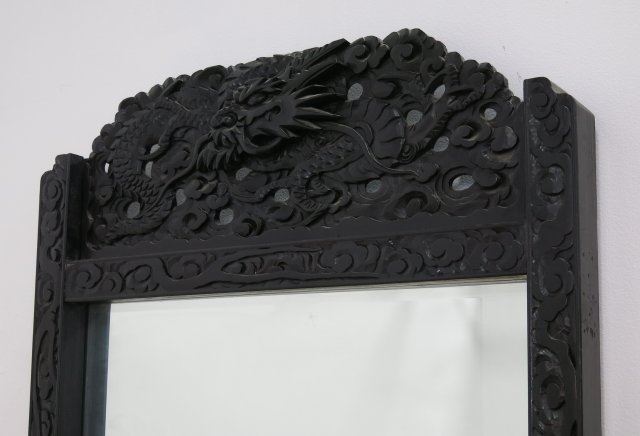 With carved scroll design on sides. Dragon pediment top. Filigree bottom panel with carved roosters and flowers. Approx. 69 1/2" H x 33" W. (4086.24)