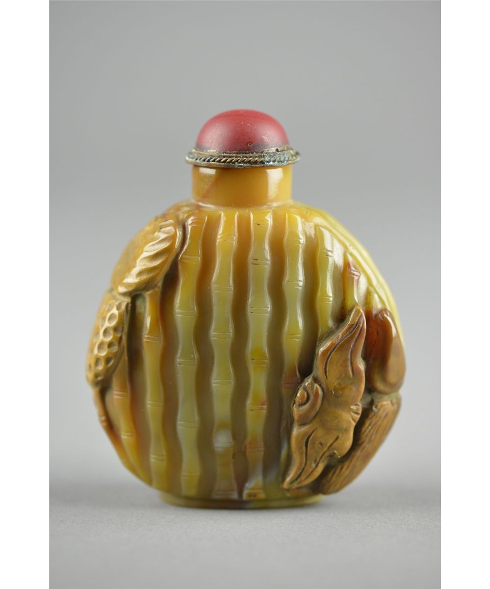 19th Century Chinese carved jade snuff bottle; ovoid body featuring bamboo trees in relief; the stone of translucent yellow-brown tone; H: 8 cm, W: 6.5 cm, 193 grams