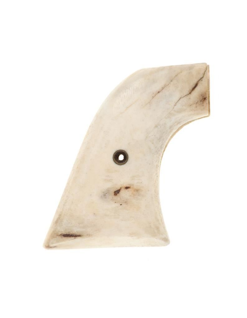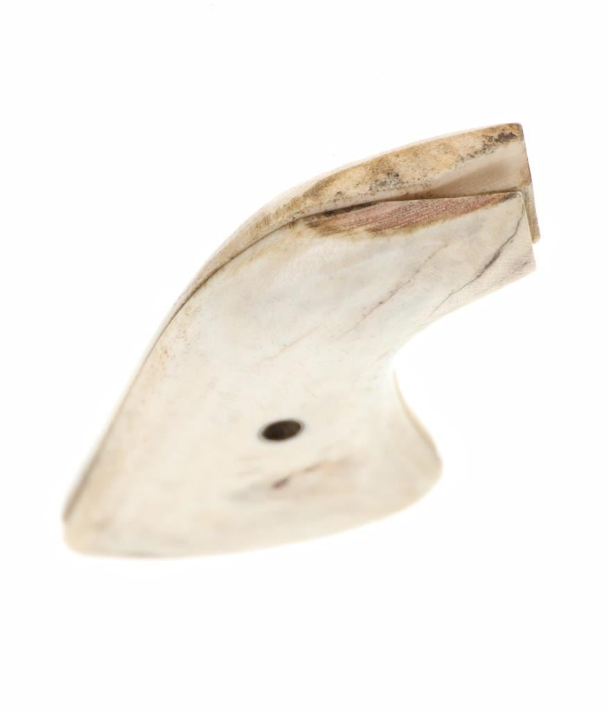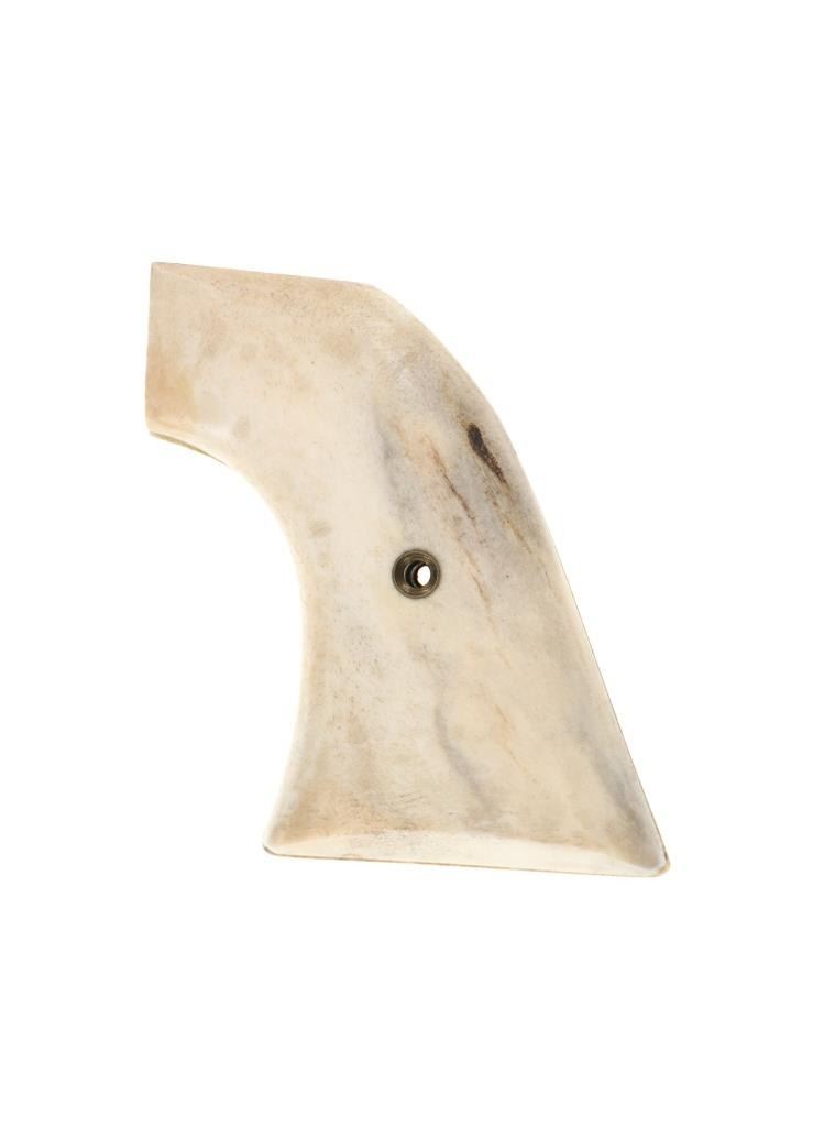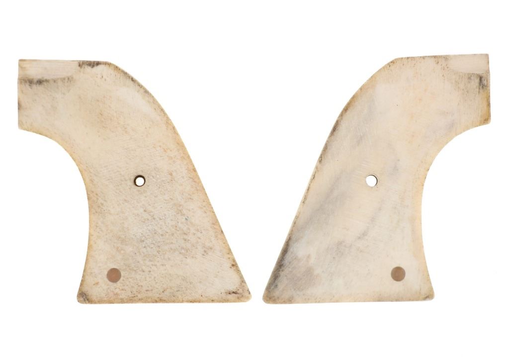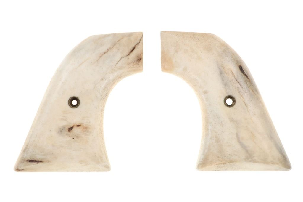 The lot features a set of antique first generation Colt Single Action Army Model 1873 revolver grips in stag antler bone. The grips shows the brass screw hole at the center and are carved from Stag Antler Bone. Custom order grips were available from Colt starting in their first year of production in 1873, but it wasn't until 1880 when grips scales moved away from the wood one-piece grips to hard rubber scales that things began to really change. From here into the turn of the century stag and bone grips became very popular and desirable by Cowboys. These are an original antique set and are well preserved, from a large antique firearms and saddlery collection. Each grip measures 3-inches by 2 7/8-inches by about 1/2-inches.