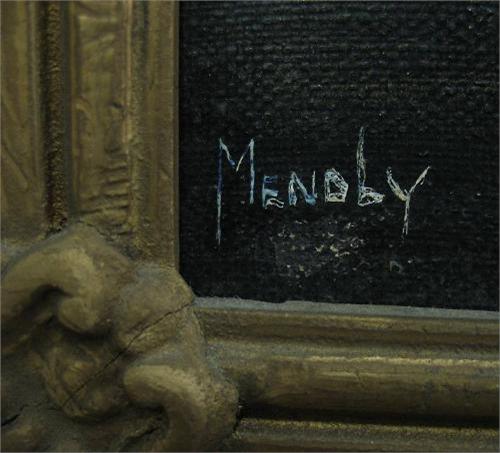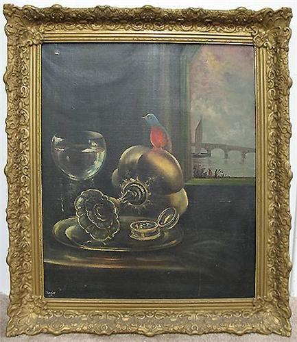 19th C. Continental School; oil on canvas still life with bird and window with scene; signed (L.L.); framed; image measures 24" x 20" (slight loss of paint in upper left corner)