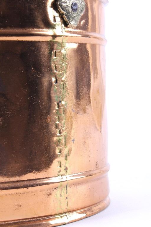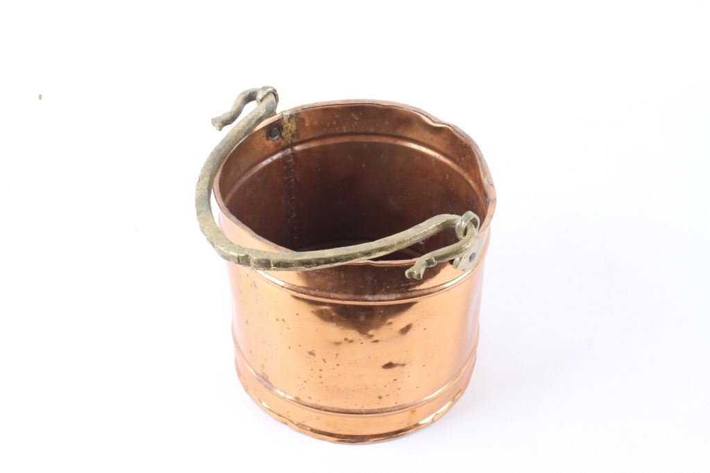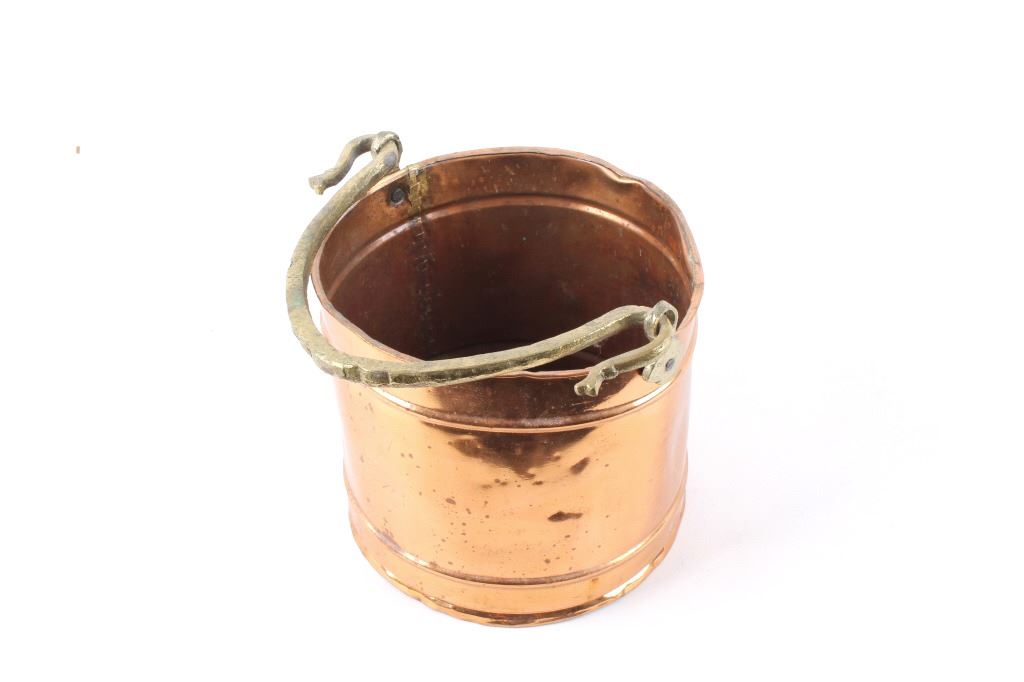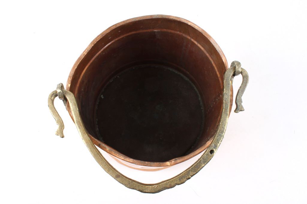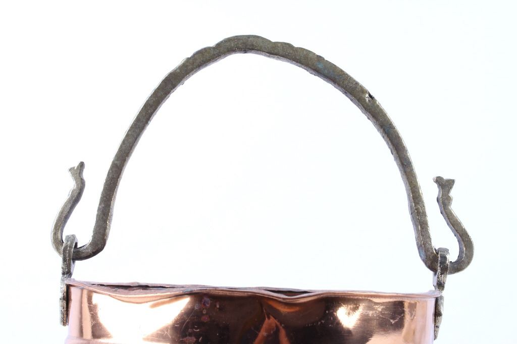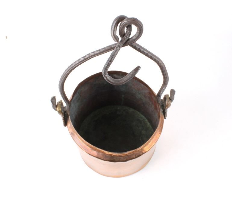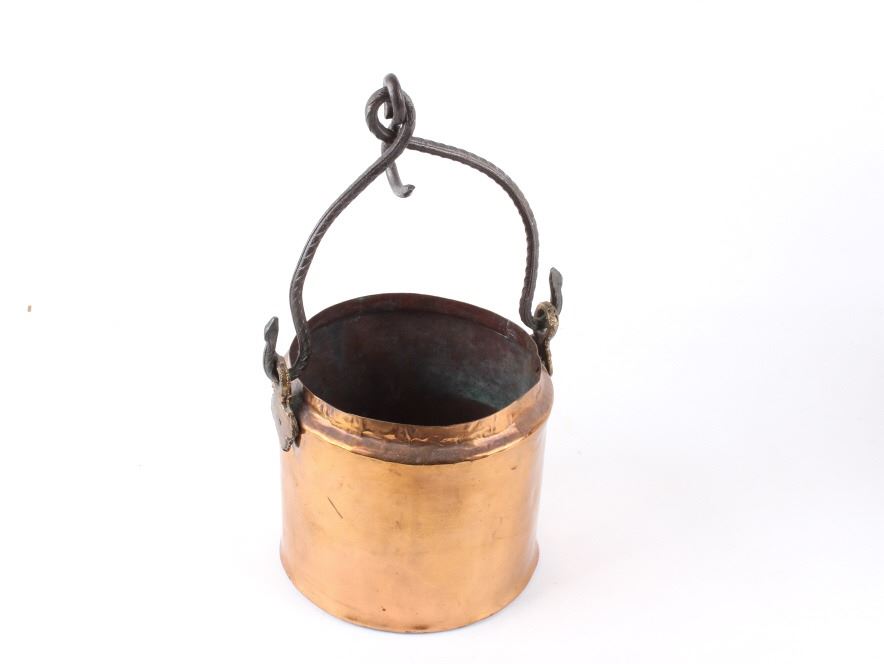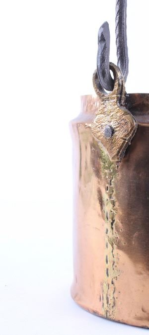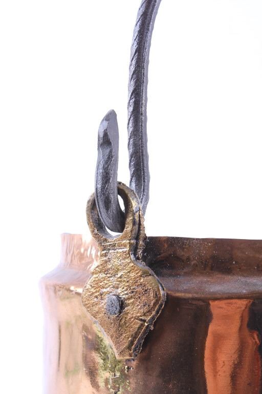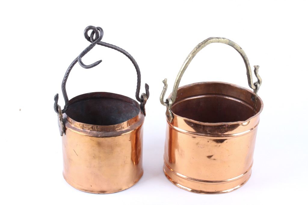 For your consideration is this pair of 19th century copper dovetail hanging kettles. The kettles both show a continental design to the dovetail joint bodies of the kettles themselves with hammered and rolled lips to the mouth of these kettles. The larger kettle shows a copper handle while the smaller kettle shows a wrought iron handle. These hanging kettles would have been used over an open hearth and would hang from a hook. The condition of these of these hanging kettles is good the large kettle shows slight denting to the rolled lip of the kettle, and both show patina to the inside and the outside of the kettle. The measurements of this 7 1/2" x 9" x 7 3/4" and 8" x 10 1/4" x 8 3/4".