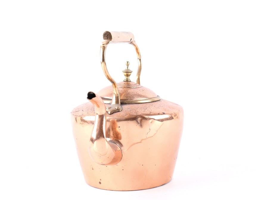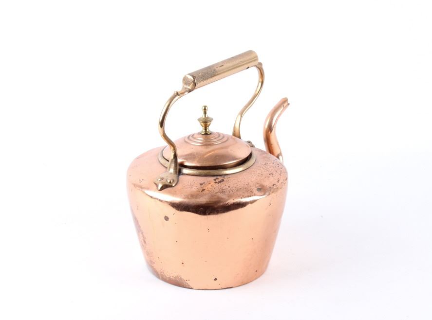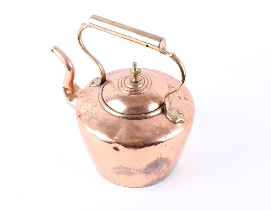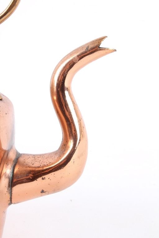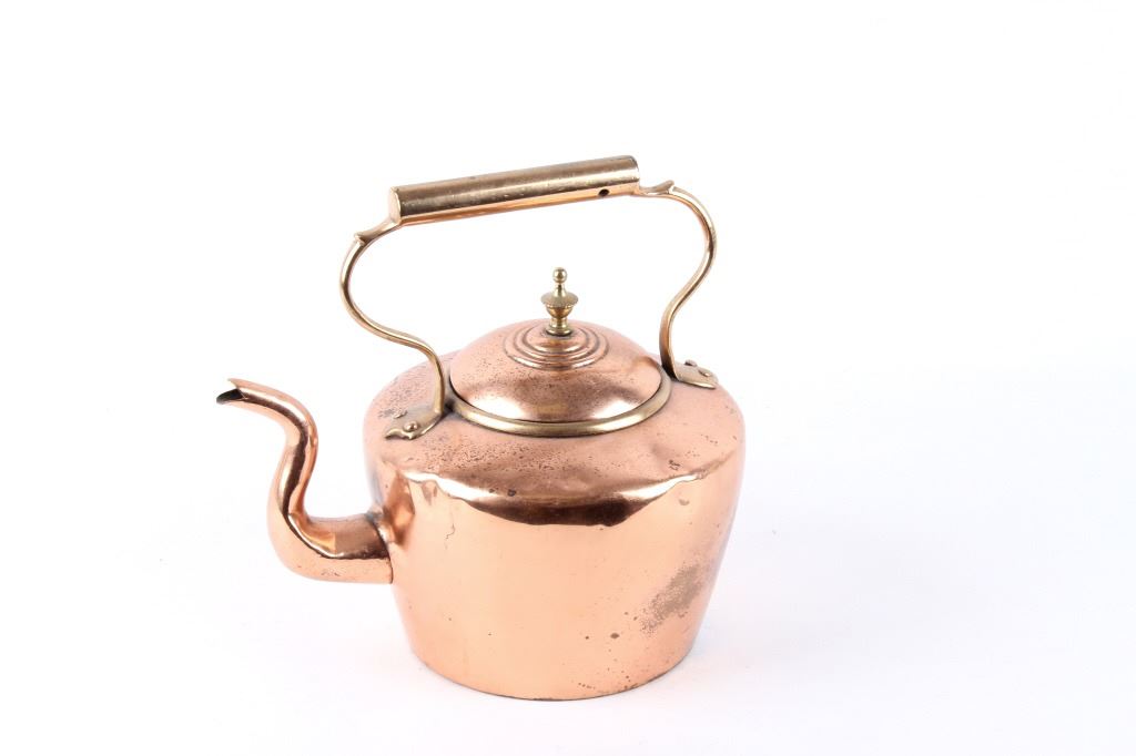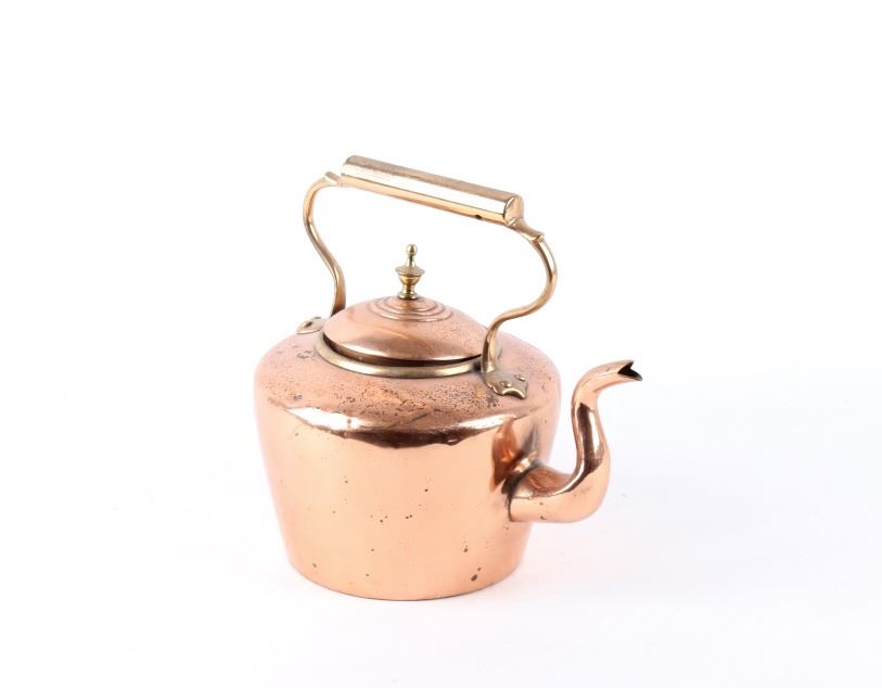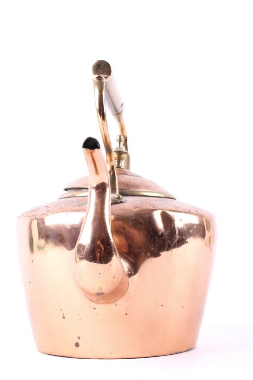 For your consideration is this 19th century copper dovetail Penn. gooseneck kettle. This kettle shows a Penn. gooseneck spout and a colonial style handle and traditional lid that fits perfectly into its body. This kettle shows very few dents and scratches though does show wear and age marks from use. The acorn lid handle is attached to an oval lid that fits snug into the body of the kettle. Pennsylvania goose neck is a style of spout that ends in an open mouth and set along the vertical dovetail joint on the body. This copper kettle is in good condition and shows a highly collectable figure with the kettle showing a well crafted and easily seen dovetail joint on the bottom of this kettle and up its body and spout. The measurements of this of this kettle are 11" x 11" x 8"