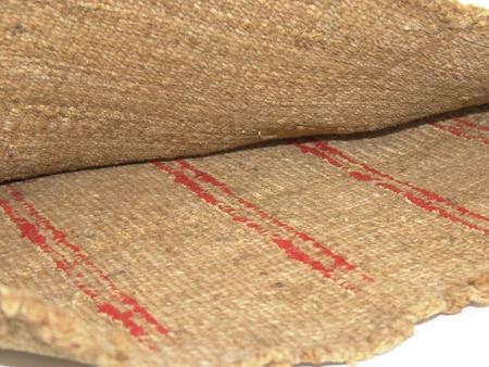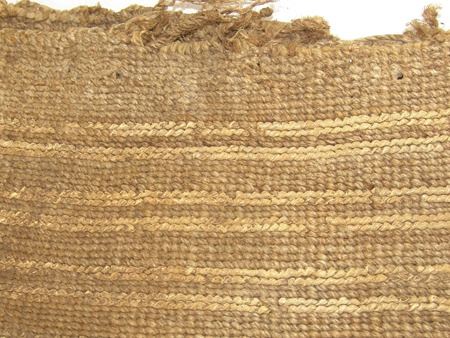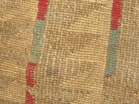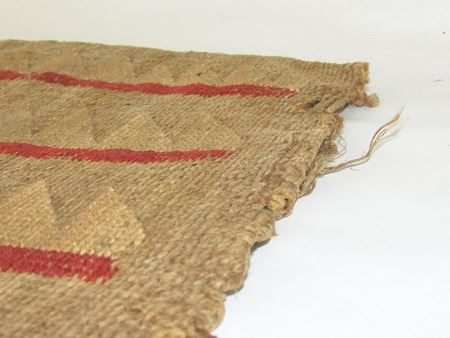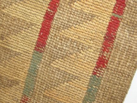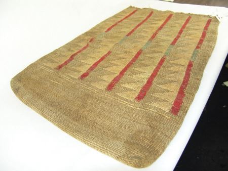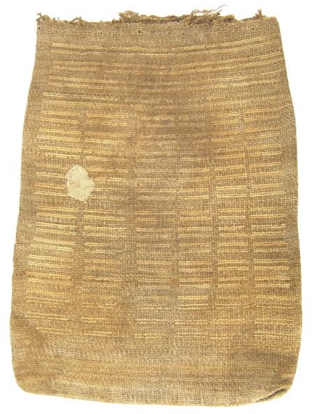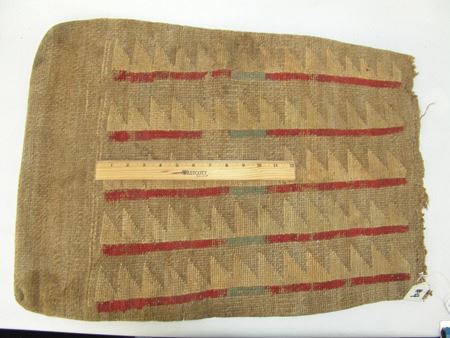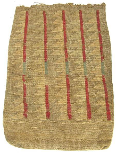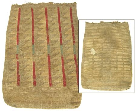 19th Century, Rare, larger-sized hand woven Nez Perce bag with interesting geometric designs on both sides, done with dyed husks and accented with woolens. Good condition, some erosion of material. 25" x 19"