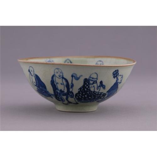 This rare crackle Celadon bowl is painted in blue under-glaze the eighteen Luohan or Buddha's disciples(9 inside and 9 outside of the bowl). It is marked as "Made in Emperor Wanli period (1573?1619) of the Ming Dynasty". Mouth Diameter