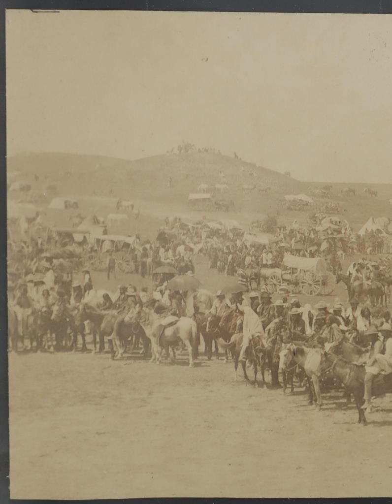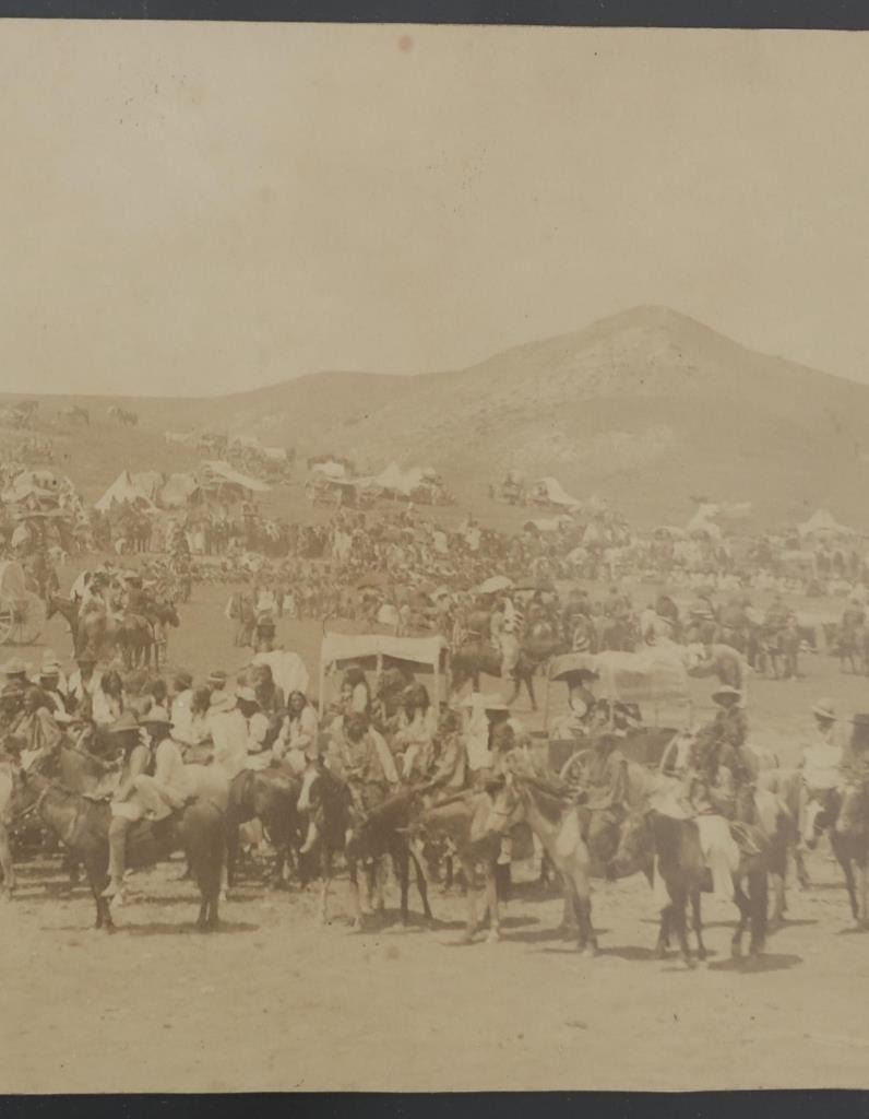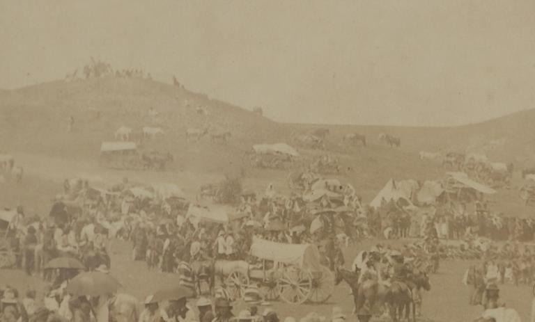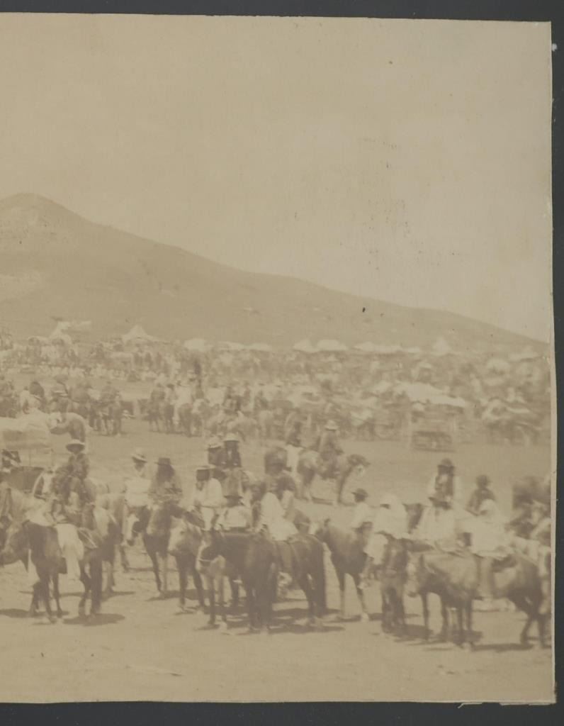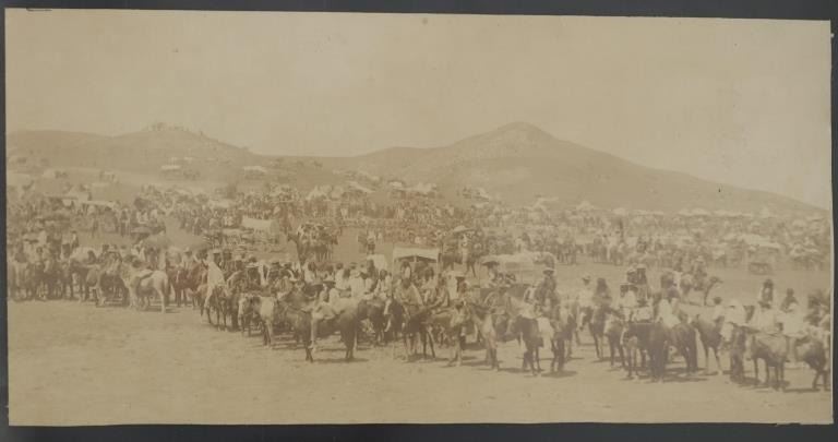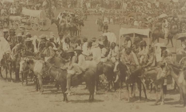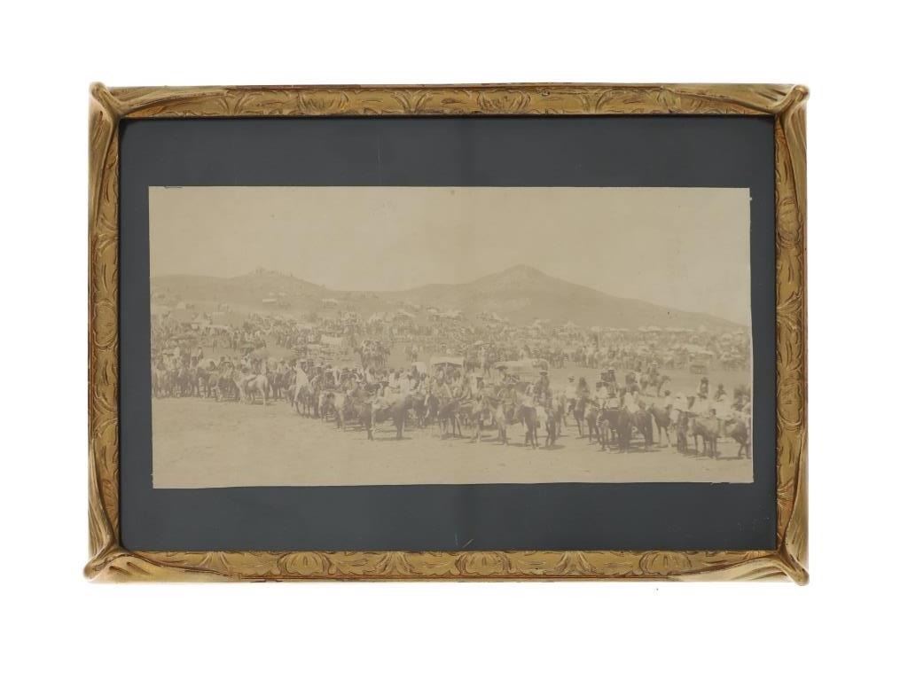Featured in this lot is a 19th century Crow Agency Montana photo by H.R. Locke. This photograph can be seen from another angle in a previously sold item. The photograph is printed in sepia coloration that shows a conglomeration of western carts and onlookers to a gathering thanks to the Crow Agency. Henry Robinson Locke (1856 - 1927) was a noted American photographer who became known for photographing the Wild West in the 19th Century and early 20th Century. He ran a studio in Deadwood, South Dakota and photographed the Black Hills area, Deadwood, Crow Indians, as well as farmers, miners, railroads. He was noted for photographing Calamity Jane in 1885 and the Little Big Horn battlefield in 1894. This photograph is marked in the negative and shows a wonderful detailed image with several lodge / tipi’s surrounded by horses with a parade of Montana Crow on horseback in full regalia at the foreground, with a whole group with the traditional umbrella’s and beaded umbrella’s in the center and in the background rows of Crow lodges / tipi’s set in front of the Montana hills.