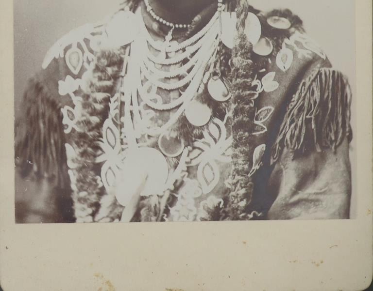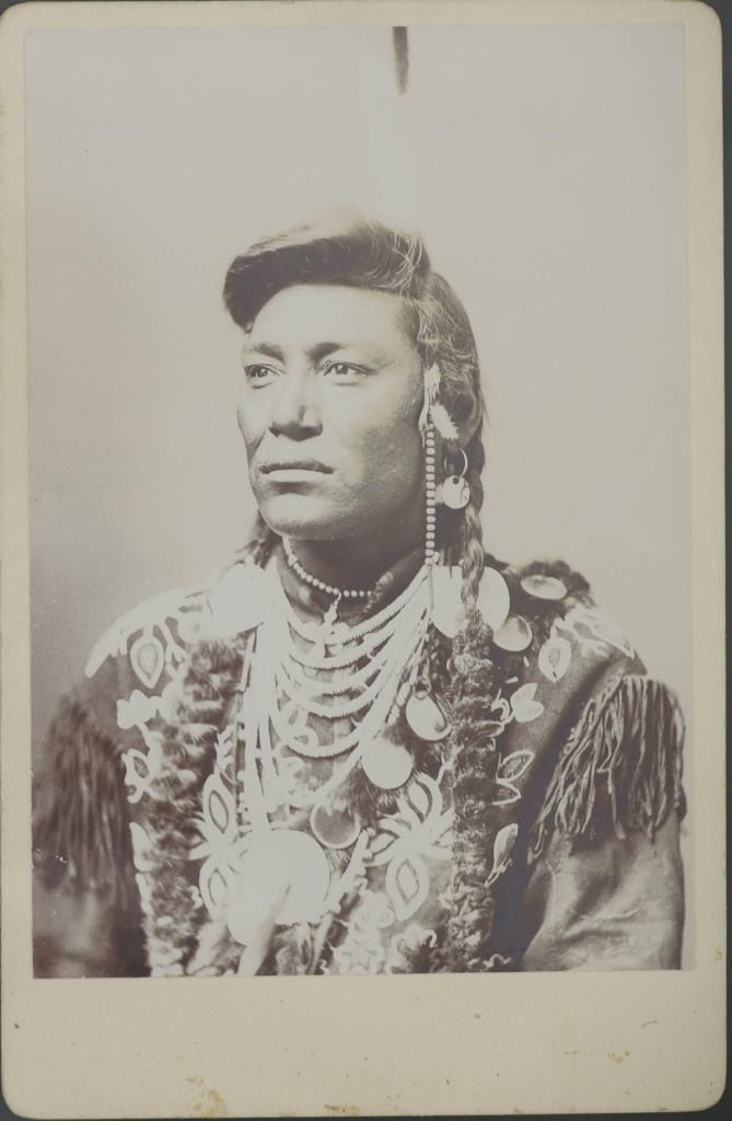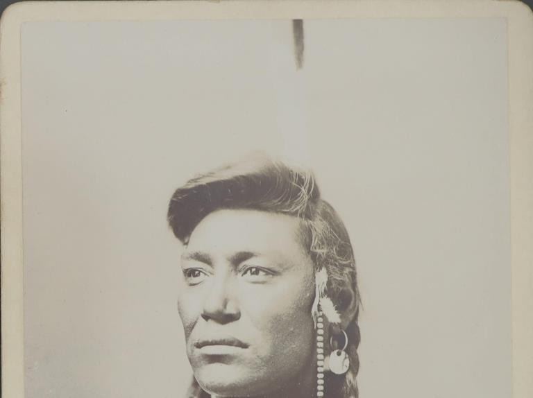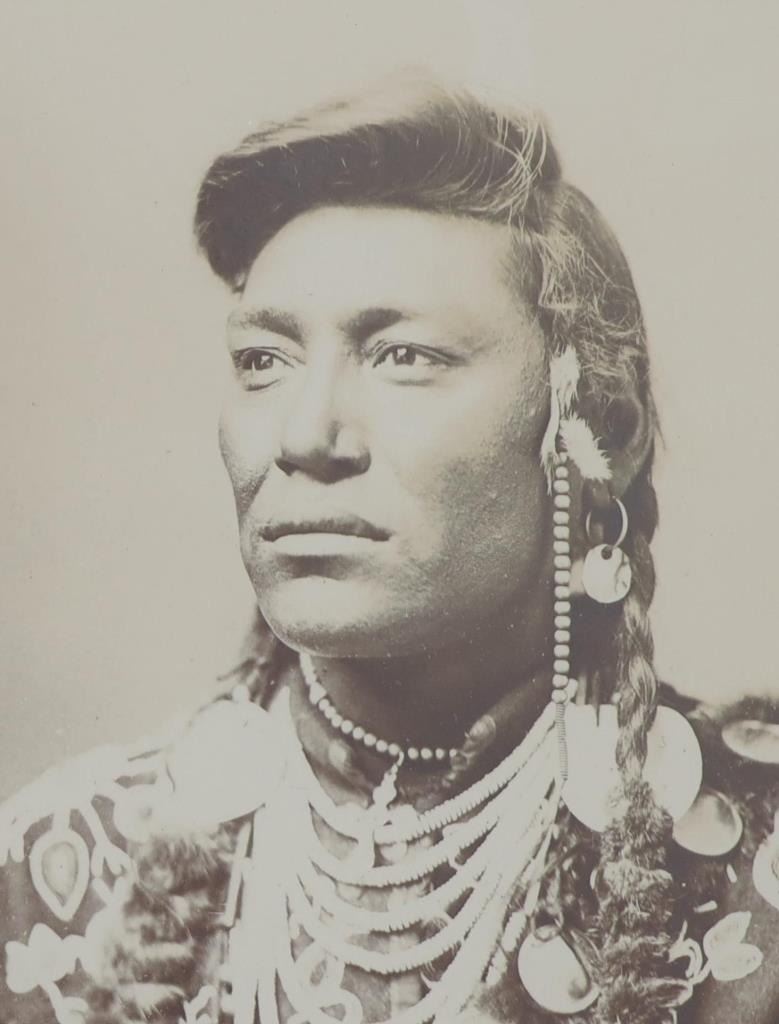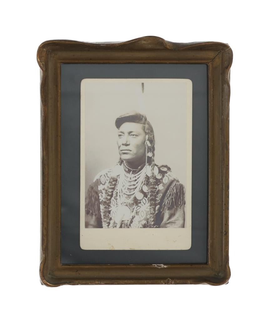 Featured in this lot is this black and white monochrome Albumen photograph of fame Crow Chief Little Head dating to the 19th Century. The photograph features a wonderfully and professionally crafted monochrome black and white construction that shows the Chief Little Head posing looking to his right with ceremonial garments and shows his long black hair. The photograph showcases the enigmatic figure of Little Head, a prominent North American Indian chief from the late 19th century. The portrait captures his dignified presence and strong leadership qualities, making it an invaluable historical artifact. Little Head's striking profile is accentuated by his long flowing hair, symbolizing his connection to nature and ancestral traditions. His piercing gaze reflects wisdom beyond his years, hinting at the countless battles fought and challenges overcome during a tumultuous era for Native Americans. The condition of this framed photograph shows some slight wear to the frame but otherwise shows no obvious signs of damage to the photograph. The measurements of this framed photograph is 9 3/8" x 7 3/8" and the visible photograph measures 5 1/2" x 3 7/8". Other Chief Little Head photographs, such as this one, are dated to circa late 1870's to early 1880's.