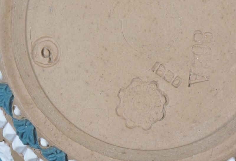 - stoneware squat vessel decorated with beading and florets, 1880. Impressed artist monogram at base.