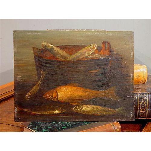 This 19th C. oil on panel depicts fish in a traditional Dutch fish basket. The work was acquired in an estate auction outside Amsterdam and it has a charming character. The painting style is slightly primitive; the colors are dark and mellow. A truly charming work with a great deal of atmosphere.