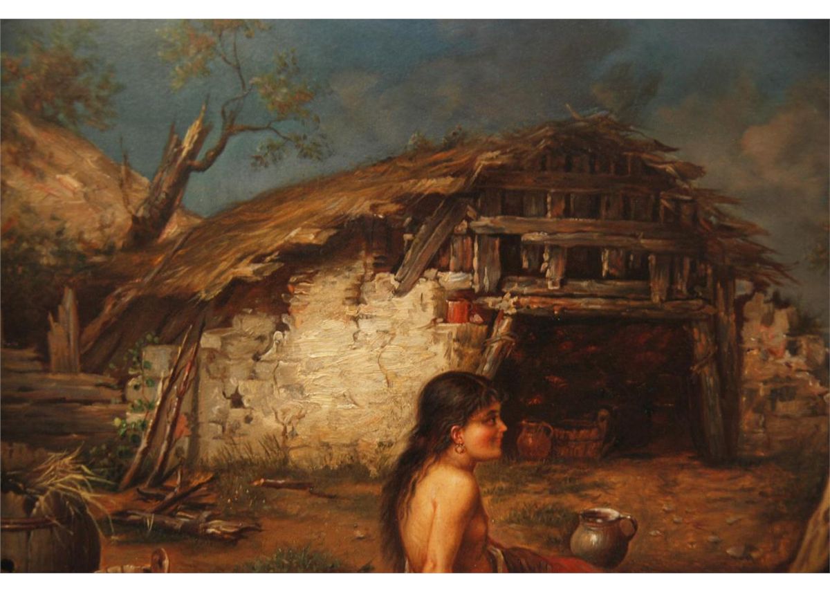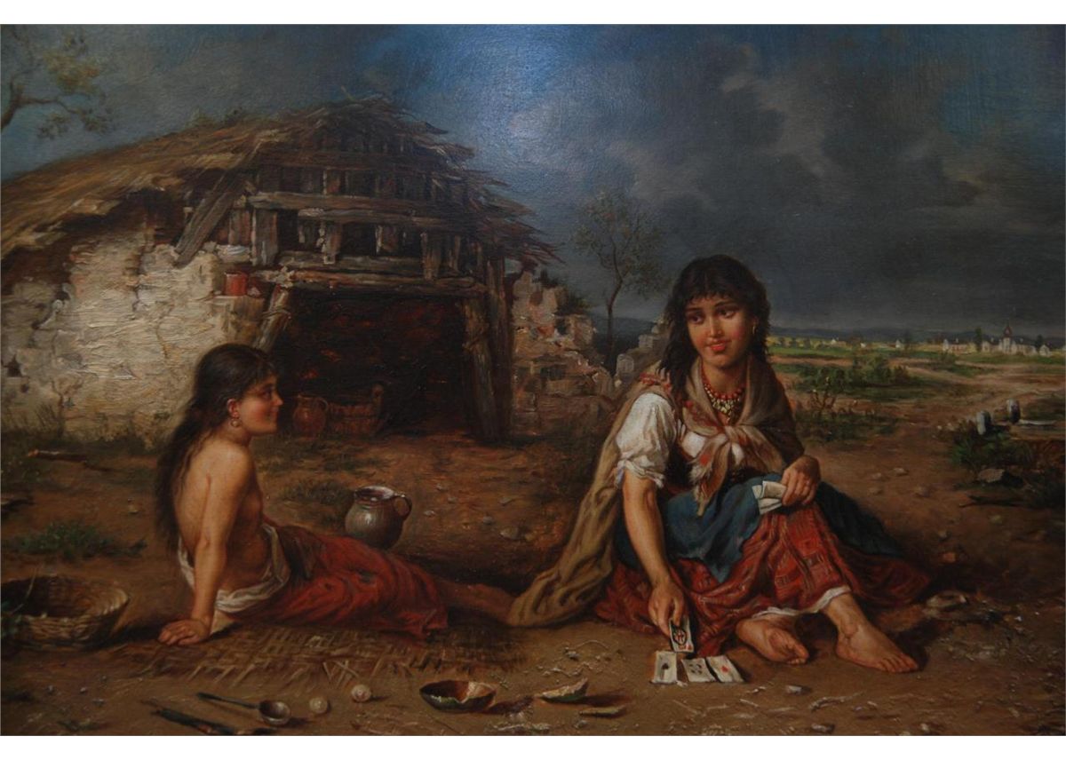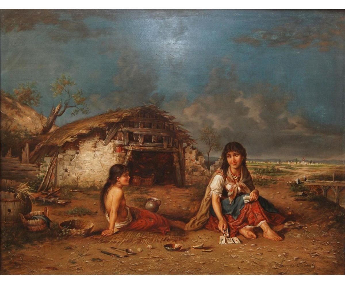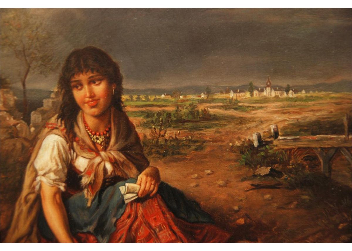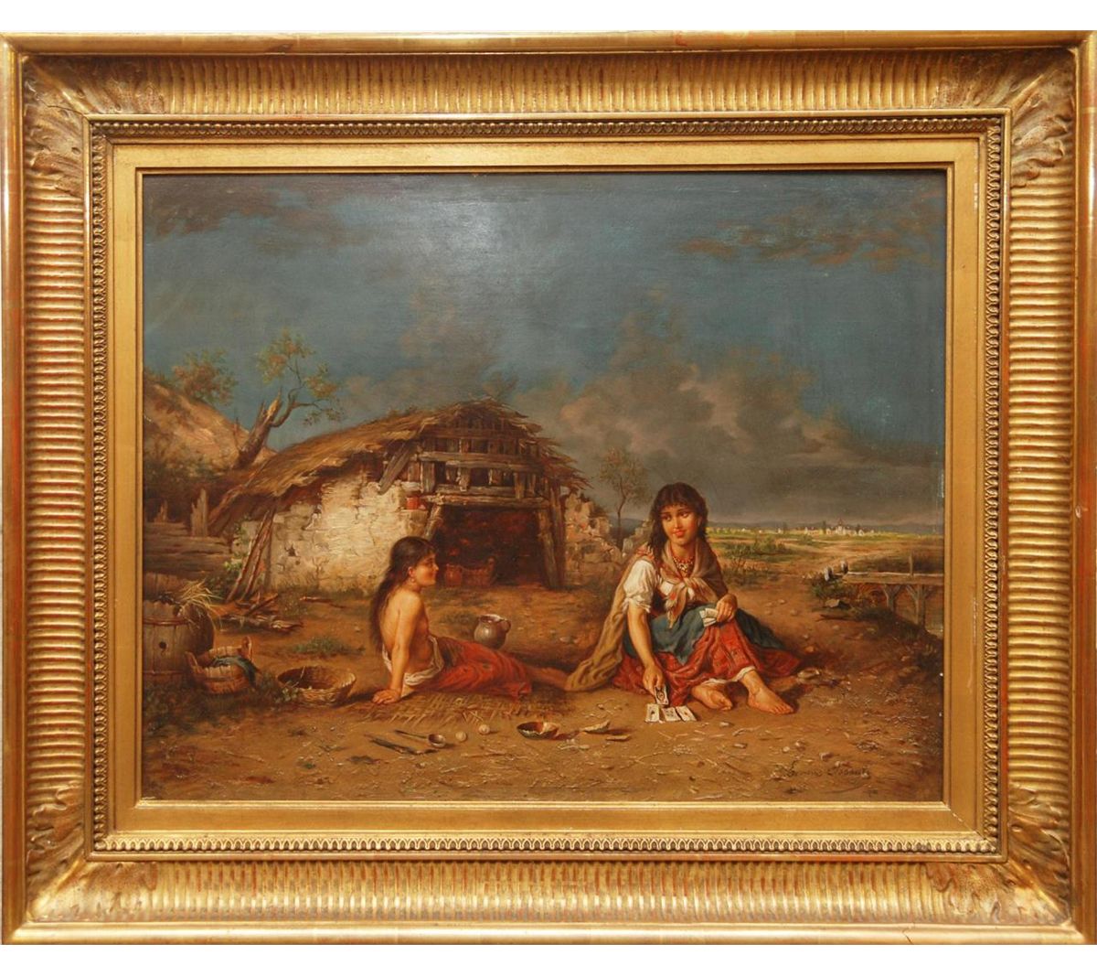 An antique European oil painting on board depicting two Gyspie children. Signed Sonnati to lower right. Measures 18 1/2" height x 24" width + 3 1/2" frame (119.3cm x 60.9cm + 8.9cm).