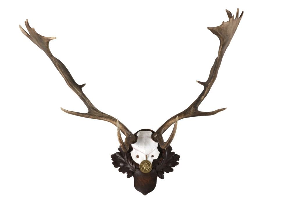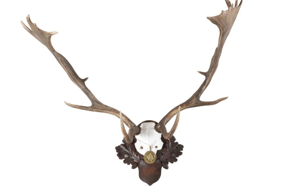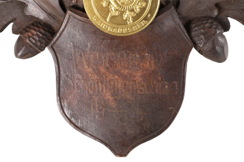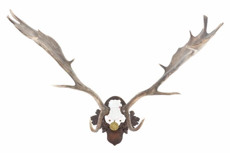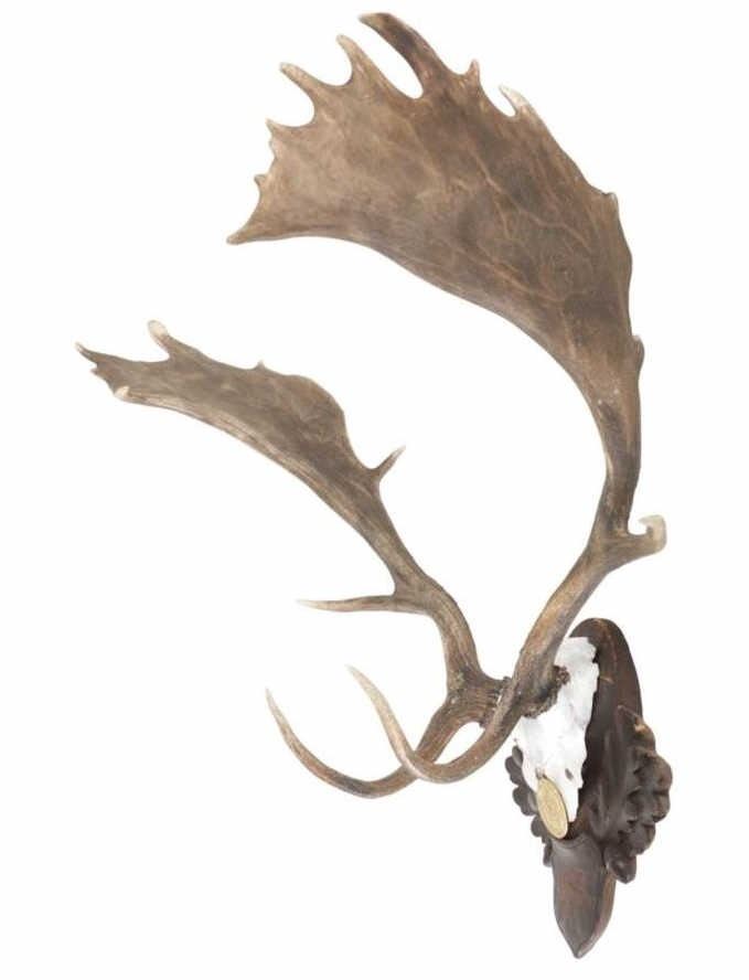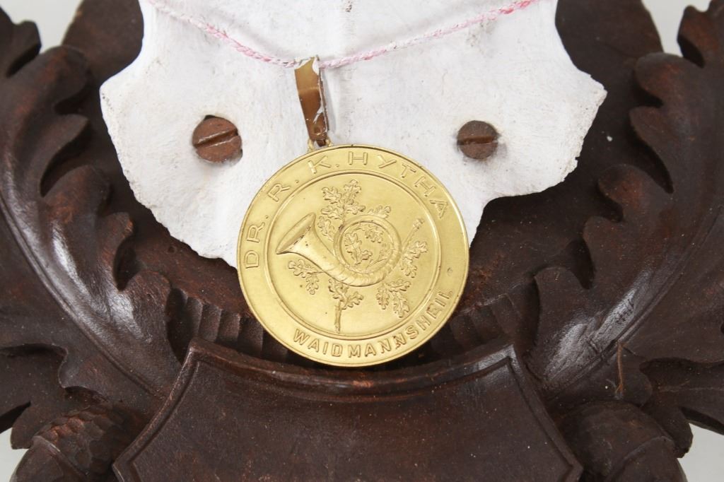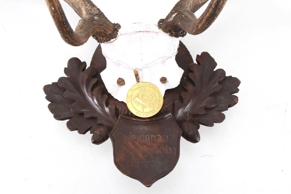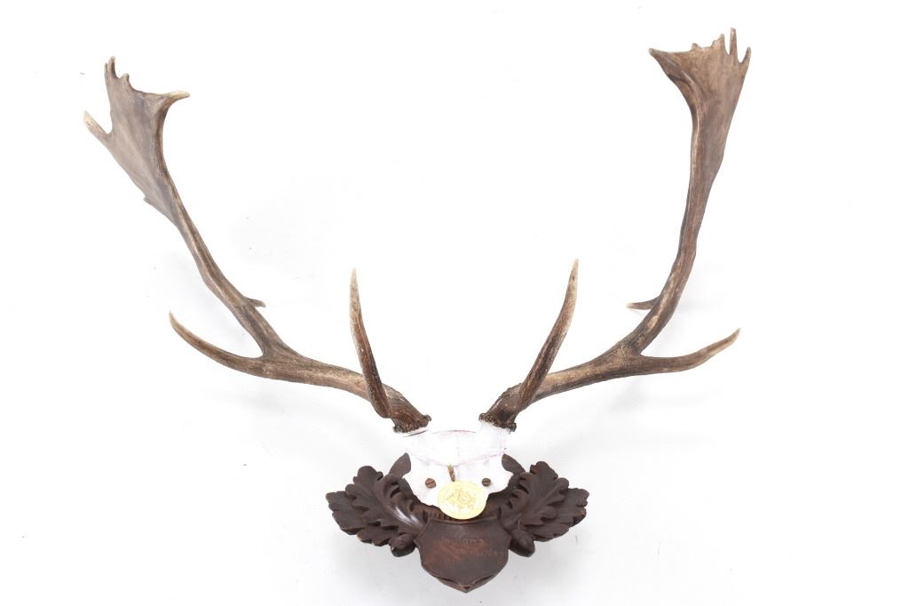 he lot features a Black Forest Austrian 19th-century Eckartsau Castle of Emperor Franz Josef Fallow Deer mount with Dr. R. K. Hytha medal "Waidmannsheid" (Good Hunting). Featured in this lot is this Fallow Deer mount taxidermy with Dr. R. K. Hytha medal "Waidmannsheid" (Good Hunting) from the Eckartsau Castle, Austria. The taxidermy features a wonderfully and professionally crafted Fallow deer antler and carved hardwood construction that shows a brass medal hanging from the skull cap. "Waidmannsheil" is a traditional German hunting greeting, meaning "good hunting" or "may the hunt be successful", and is used among hunters to wish each other luck before or after a hunt. The taxidermy comes with antique Habsburg antlers from the Eckartsau Castle of Emperor Franz Josef in the Southern Austrian Alps, a favorite hunting Schloss of the Habsburg family. Part of The European Hunt Collection, this grouping of antique hunting trophies from Royal and Noble families of Germany & Austria has been examined and appraised by James Supp of Coronado Trading Co., who is best known for his work. The shield is marked as follows: Weidenau Schonleinschlag - 1934 (very faintly). The condition of this example of Fallow deer skull cap is good and well preserved with some wear to the hardwood shield its mounted on. The measurements of this fallow deer mount is 33" x 28 1/4" x 26 1/2". The collective weight of this deer mount is 5lb 8oz. Provenance: From a prominent ex-Bozeman private collection who purchased the majority of his collection from Cowan's, Skinner, Bonhams, Morphy's, Sotheby's, March in Montana, North American Auction and other well revered auction houses.
