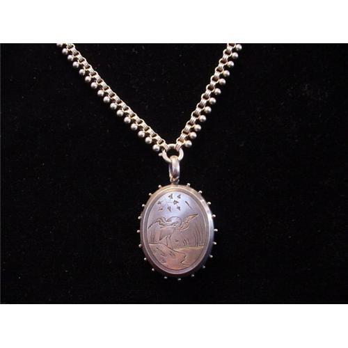 Lovely 19th C. silver locket with engraved water bird standing on the shoreline. Locket measures 1 1/2" by 1 1/4" and has beading along the edge. The engraving is exquisite and the beading all intact. The interior holds two pictures and is complete with glass covers. The 19th C. silver chain is also beaded and compliments the locket beautifully. Chain measures 18" long and is 1/4" wide. Excellent condition. Circa 1880.