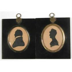 19th C. English school pair of painted silhouettes, Portraits of a lady and gentleman, Ovals, 3.5 x 2.75 ins. £80-120