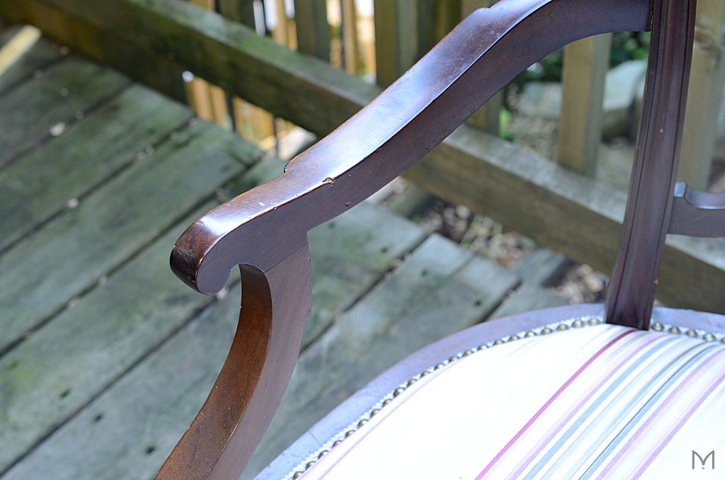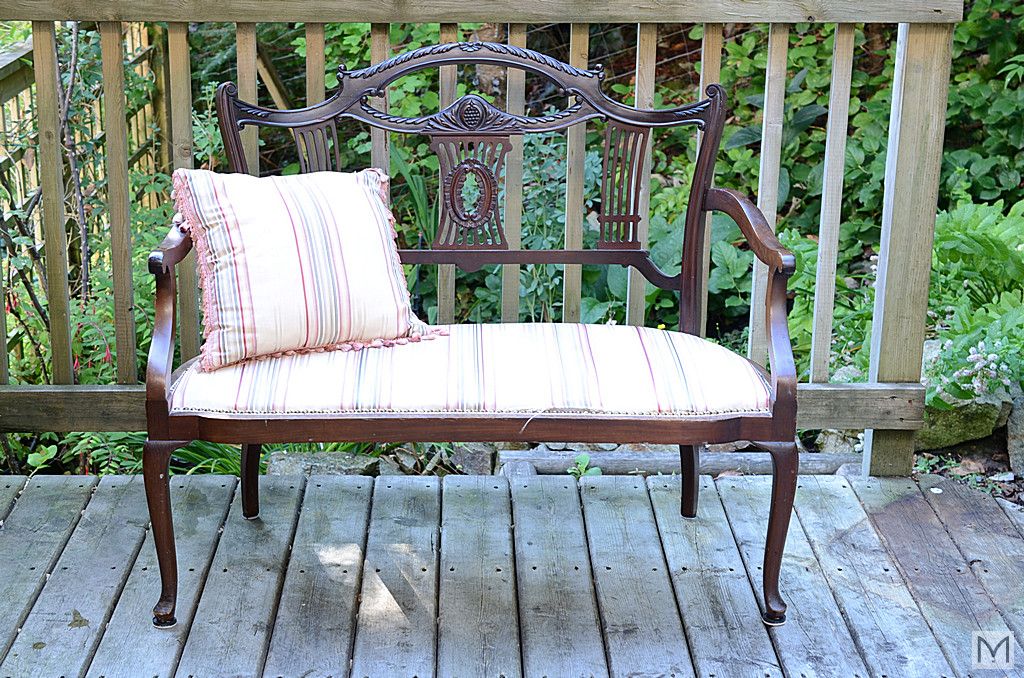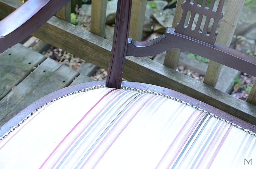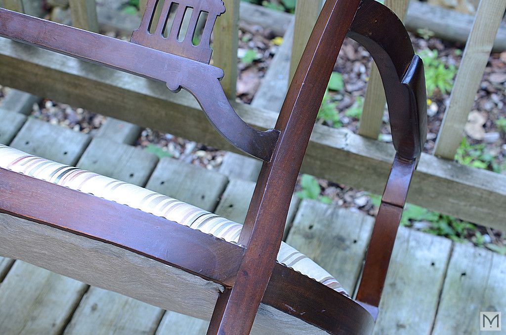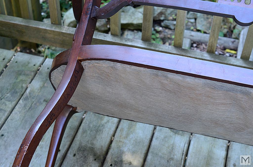 Very good antique condition, some minor chips, losses and scratches as shown. Could benefit from being re-upholstered as fabric is shown wear at front.
