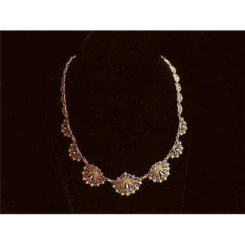 Exquisite hand crafted French 18K yellow gold necklace from the 19th C. This necklace has seven heavy openwork gold swags graduating to ten lighter filigree links on each side. The center swag is 7/8" wide by 2" long and graduates to the back swags which are 3/16" wide and 7/16" long. The necklace measures 17" long and weighs 27.4 grams. It is a beautiful shade of yellow gold with a hint of rose gold. Spring ring and safety chain. Circa 1880. Excellent condition.