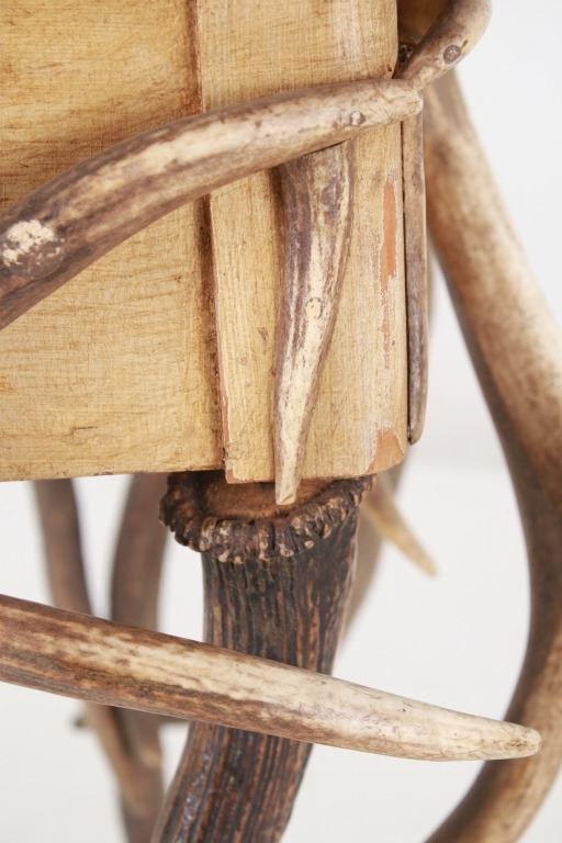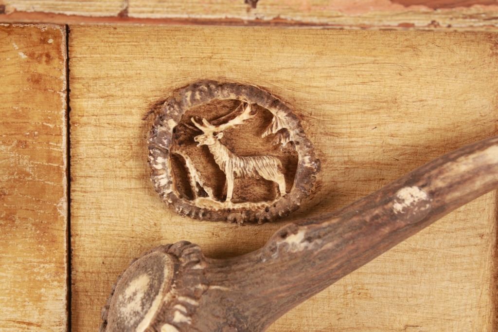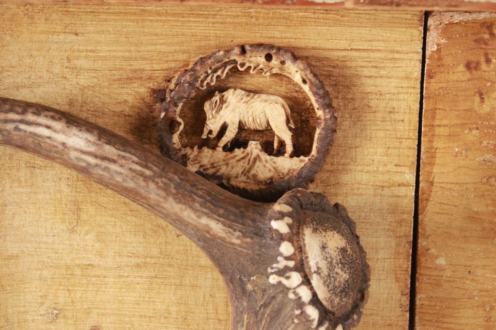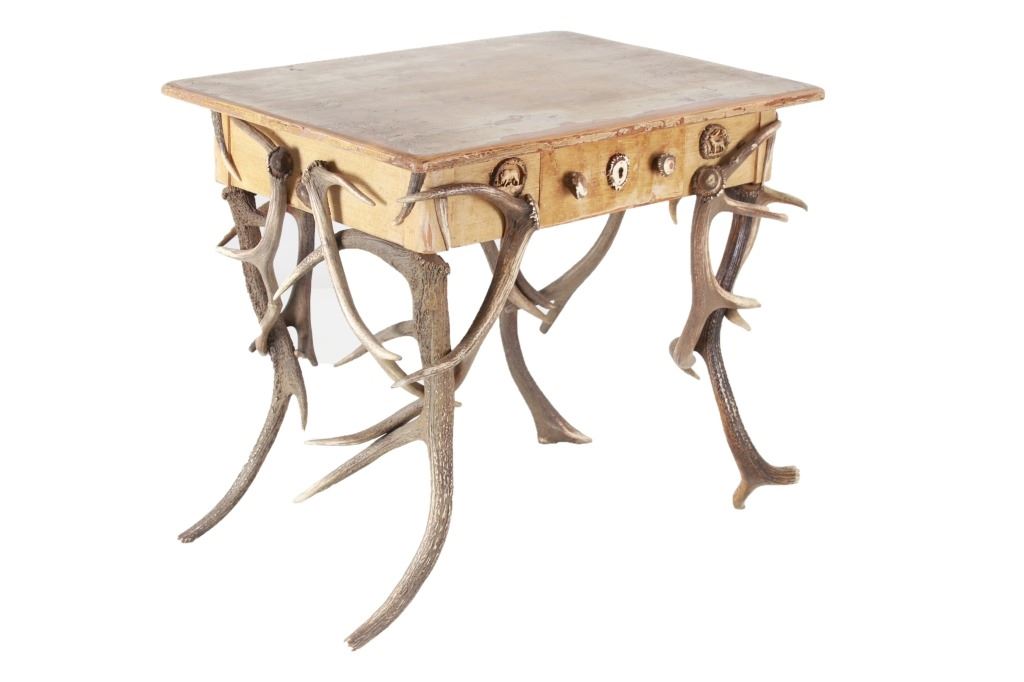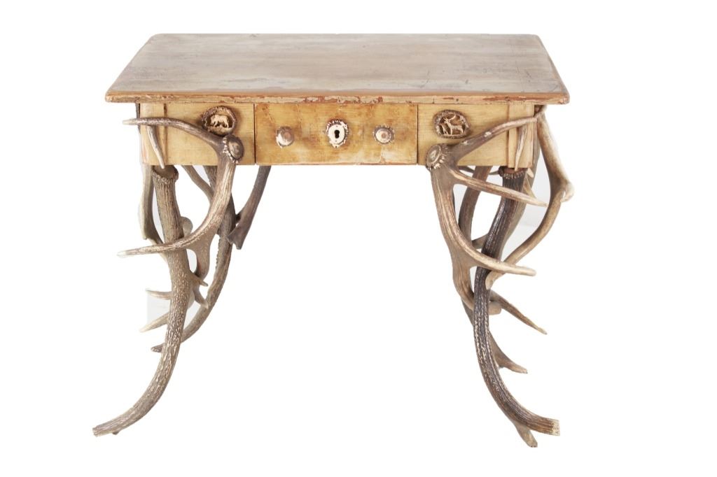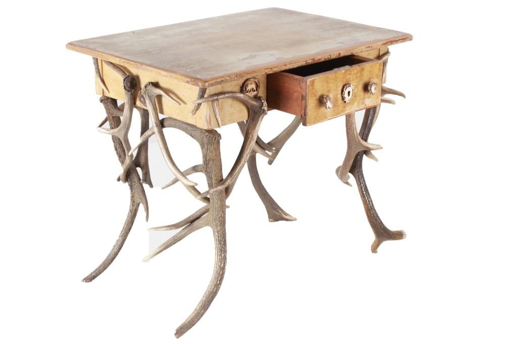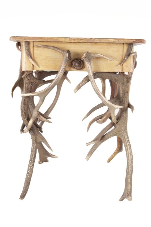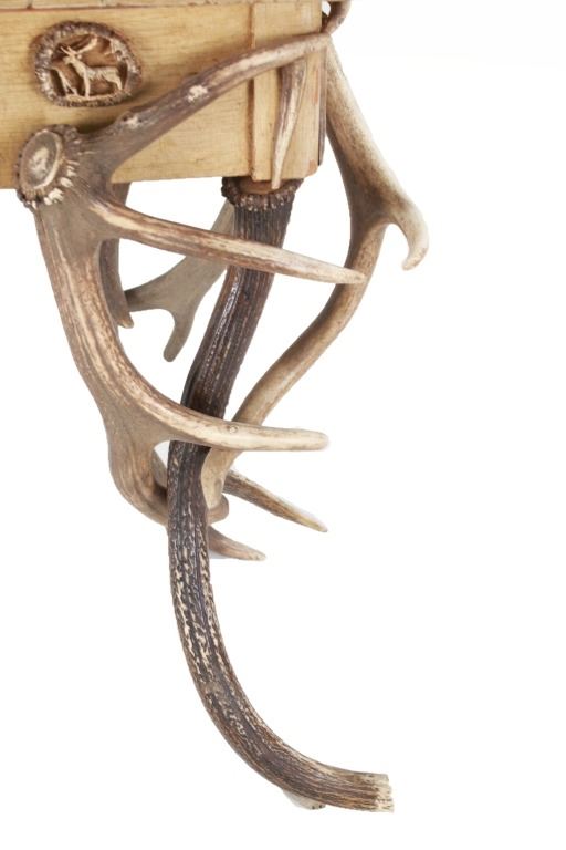 Offered in this lot is an amazing, early antique 19th Century French Walnut Antlers and Burls Table. The American West as both a concept and an actual place was considered by some French artists as forward looking and something new to discover. This Black Forest style antler & carved burl table features antlers placed around the edges in a decorative style. Adorning the front rail and drawer are carved burls, with the top left burl showing a carved image of a boar and the top right showing an image of a red deer stag. Smaller burls decorate front drawer pulls and key slot (key not included), side and rear rails. Large antlers serve as the table legs, smaller antlers decorate the front, side and rear rails as well. It shows good condition overall with slight wear present from its age and use. No major signs of damage or cracks noted. The table measures 26"W x 36.5"L x 29"H and weighs 41 pounds.