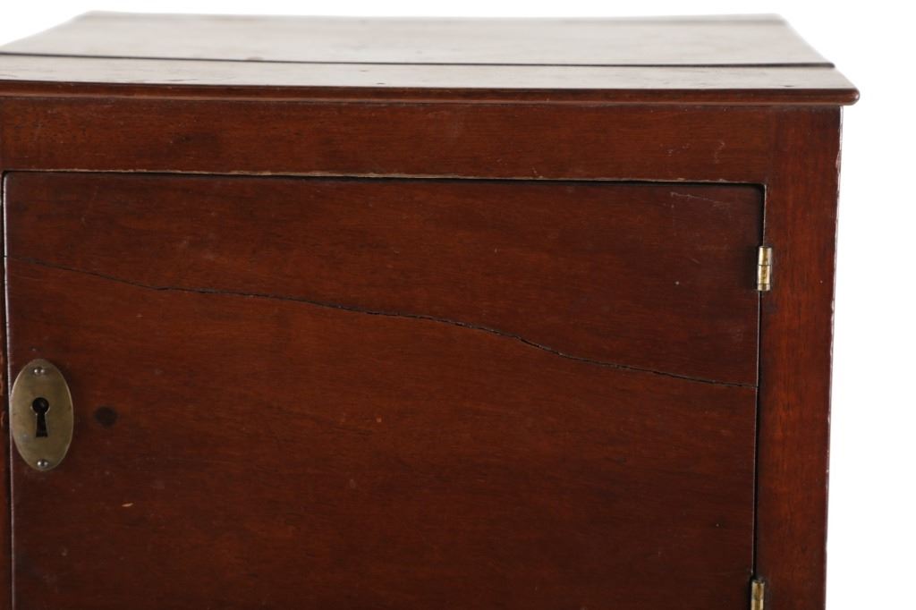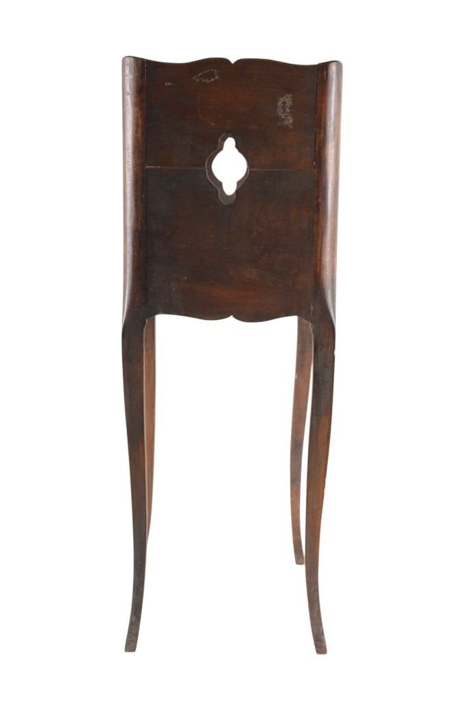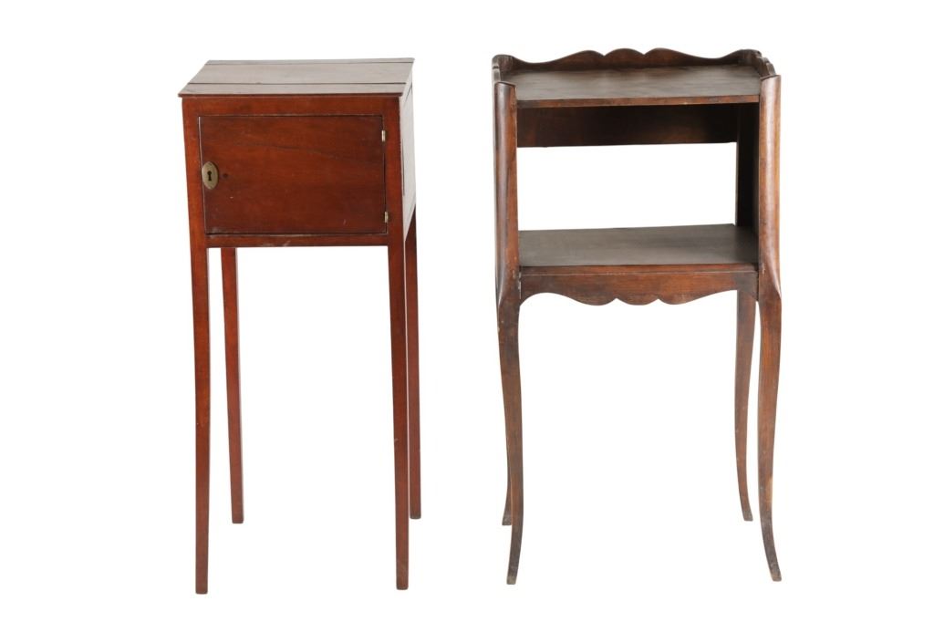 For your consideration are a 19th Century French Louis XV Style Chevet Side Table and a Hepplewhite Federal Era Mahogany Side Table, early 19th Century New England. Ex-Boston area estate collection. The early 19th century French Louis XV style wooden bedside table features a three-quarter gallery, open shelf and cabriole legs. This French Louis XV style 'table de chevet', a bedside table or nightstand, features a rectangular top surrounded by a three-quarter scalloped edged gallery, sitting above an open shelf offering a convenient storage area. The table is raised on four elegant slender cabriole legs, reminding us of the taste for curvy lines of the Louis XV period. The décor is kept at the minimum with side cutouts, curved side rails and curved apron, allowing the wood grain to stand out beautifully. Hand-grasp side cut-outs facilitate portability and placement. Remarkably lightweight but structurally sound and steady. A rich patina observed throughout. Lower portion of rear panel missing. Hepplewhite design furniture is named for London designer and cabinetmaker George Hepplewhite, the furniture originated between 1780 and 1810, during the Federal period in the United States. The style was neoclassical, quite popular between New England and the Carolinas. A key differentiator from other works of the period and before is the straight legs, which can be square or tapered. This early 19th century Hepplewhite Federal-style Side Table features a single, locked centre storage drawer, key missing. Tapered legs design with rectangular spade feet. 'Worm-holed' and cracked panel underside bottom of drawer, with a rich patina noted throughout. Measures 29.25"H x 12.25"W x 12.25"D, chevet table is 29.5"H x 15.75"W x 10.5"D. Respective weight are 5lb, 10 oz. and 8lb. 14oz.