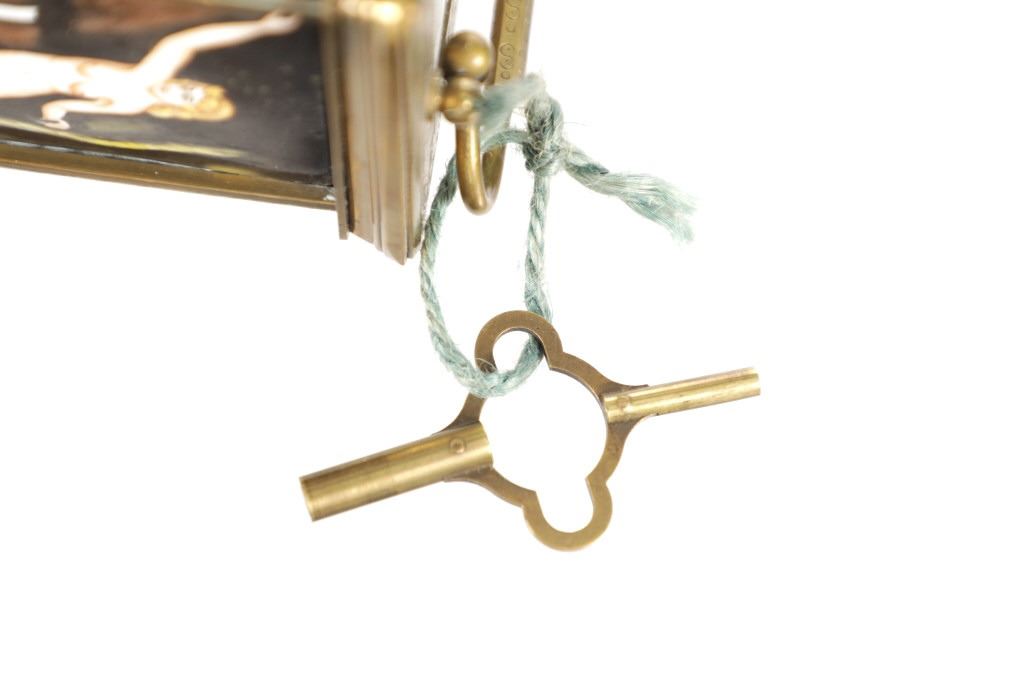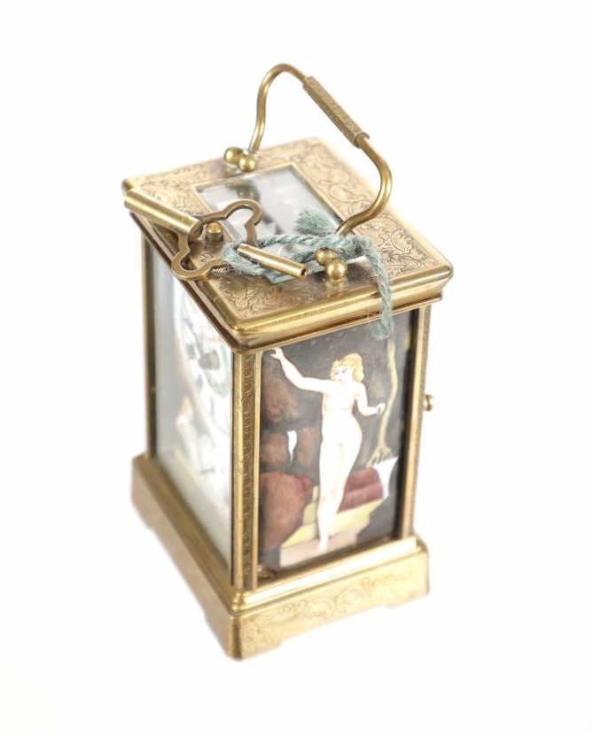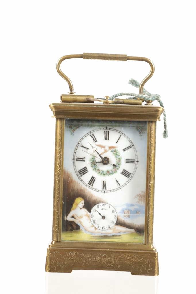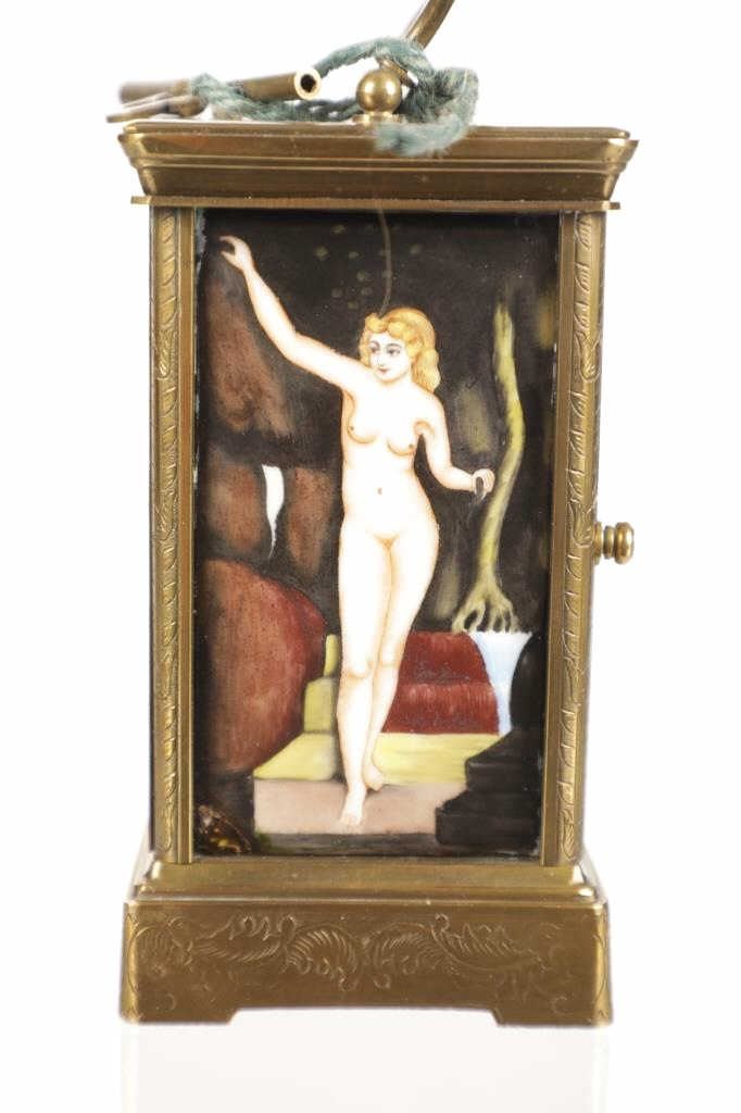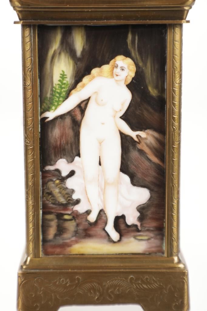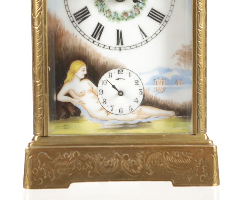 Featured in this lot is this 19th century French enameled repeater carriage clock. The clock features a wonderfully and professionally crafted bronze and enameled glass construction that shows two painted nude women on the sides of the and the clock face shows Roman numerals with a nude woman laying below the second hand. The clock mechanism is marked 'Made in France' underneath the bell. The condition of this mantle clock shows some patina to the clock and a crack in the back glass door with some wiggle to the glass window of the front of the clock. The measurements of this mantle clock is 8" x 4" x 3 1/4". The collective weight of this mantle clock is 4lb 6oz.