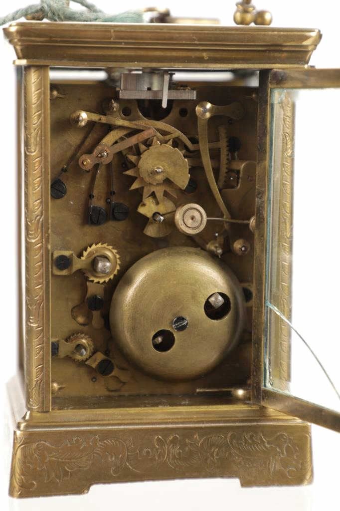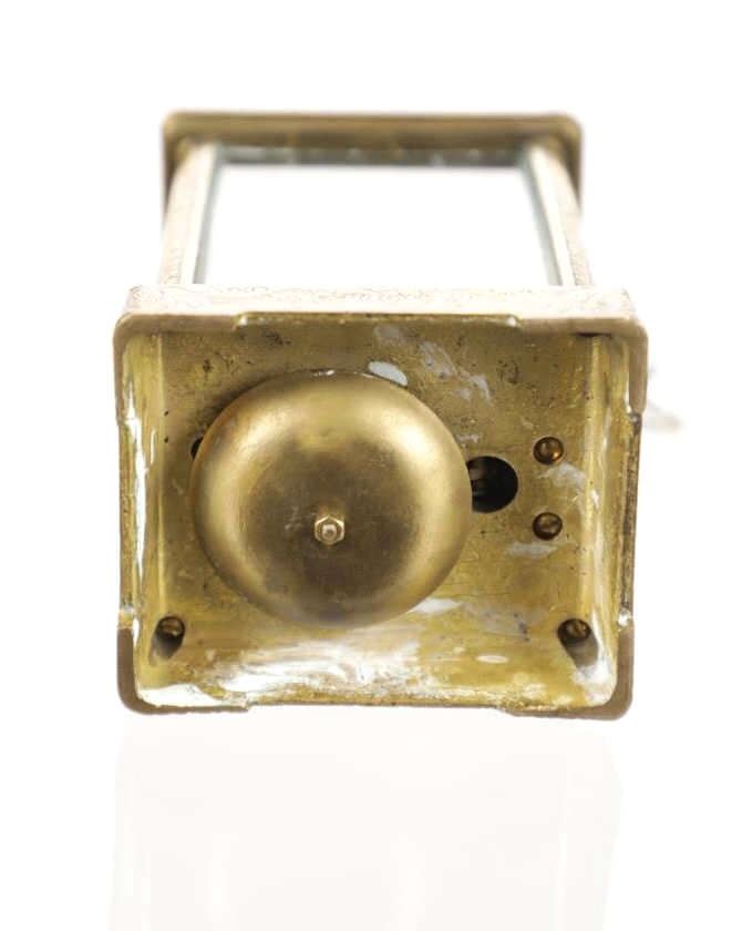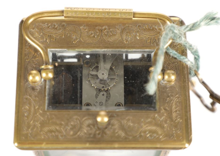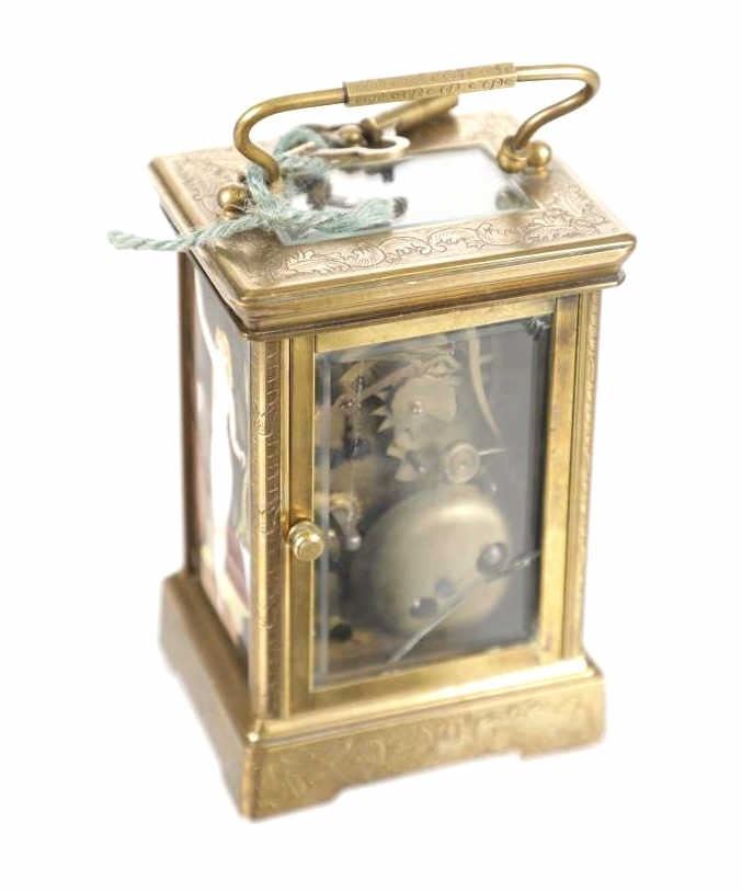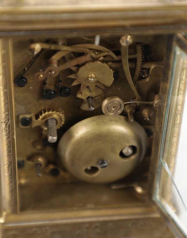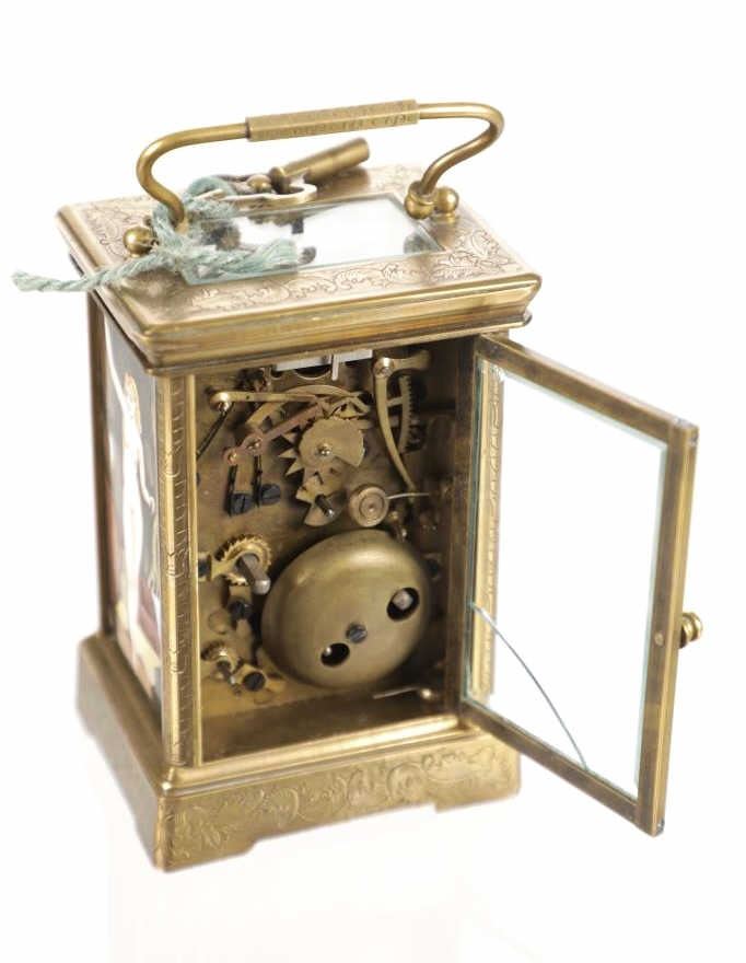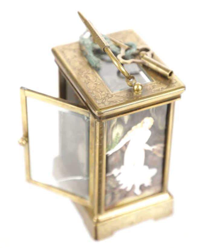 Featured in this lot is this 19th century French enameled repeater carriage clock. The clock features a wonderfully and professionally crafted bronze and enameled glass construction that shows two painted nude women on the sides of the and the clock face shows Roman numerals with a nude woman laying below the second hand. The clock mechanism is marked 'Made in France' underneath the bell. The condition of this mantle clock shows some patina to the clock and a crack in the back glass door with some wiggle to the glass window of the front of the clock. The measurements of this mantle clock is 8" x 4" x 3 1/4". The collective weight of this mantle clock is 4lb 6oz.