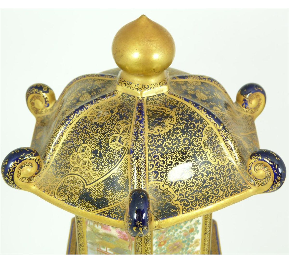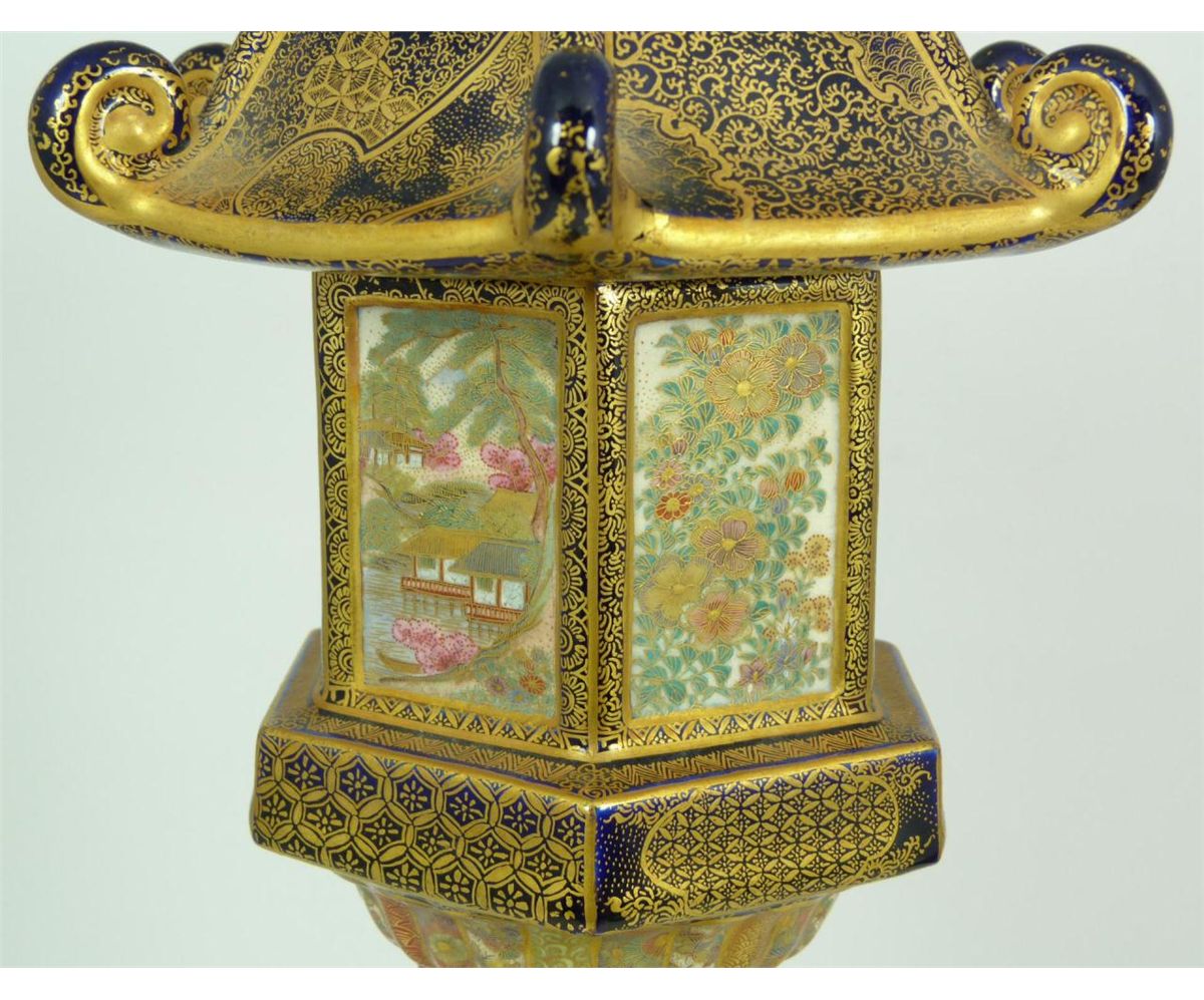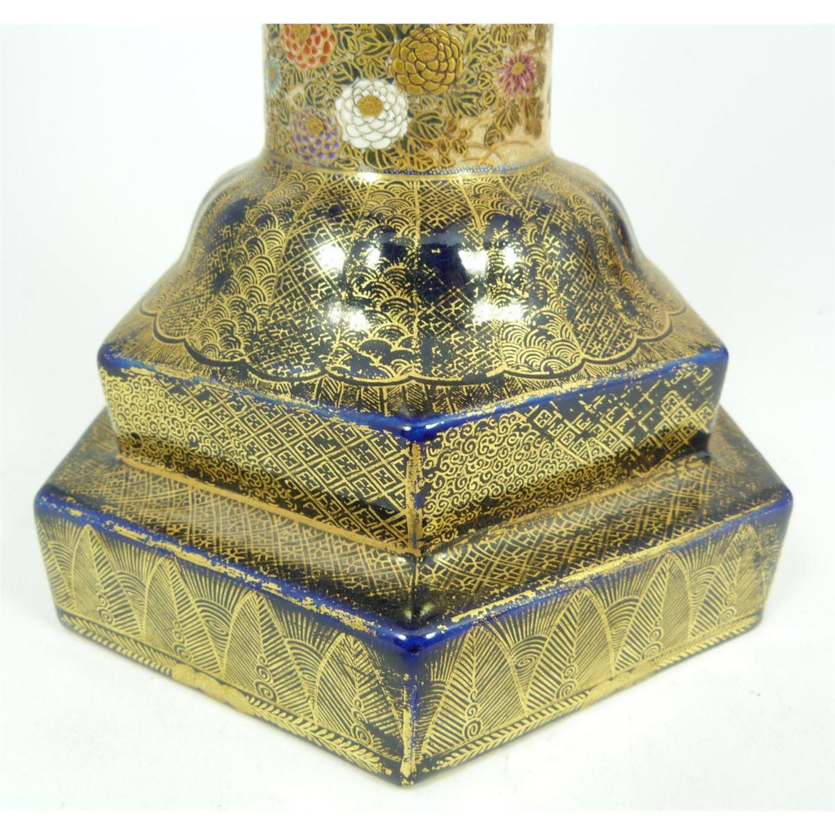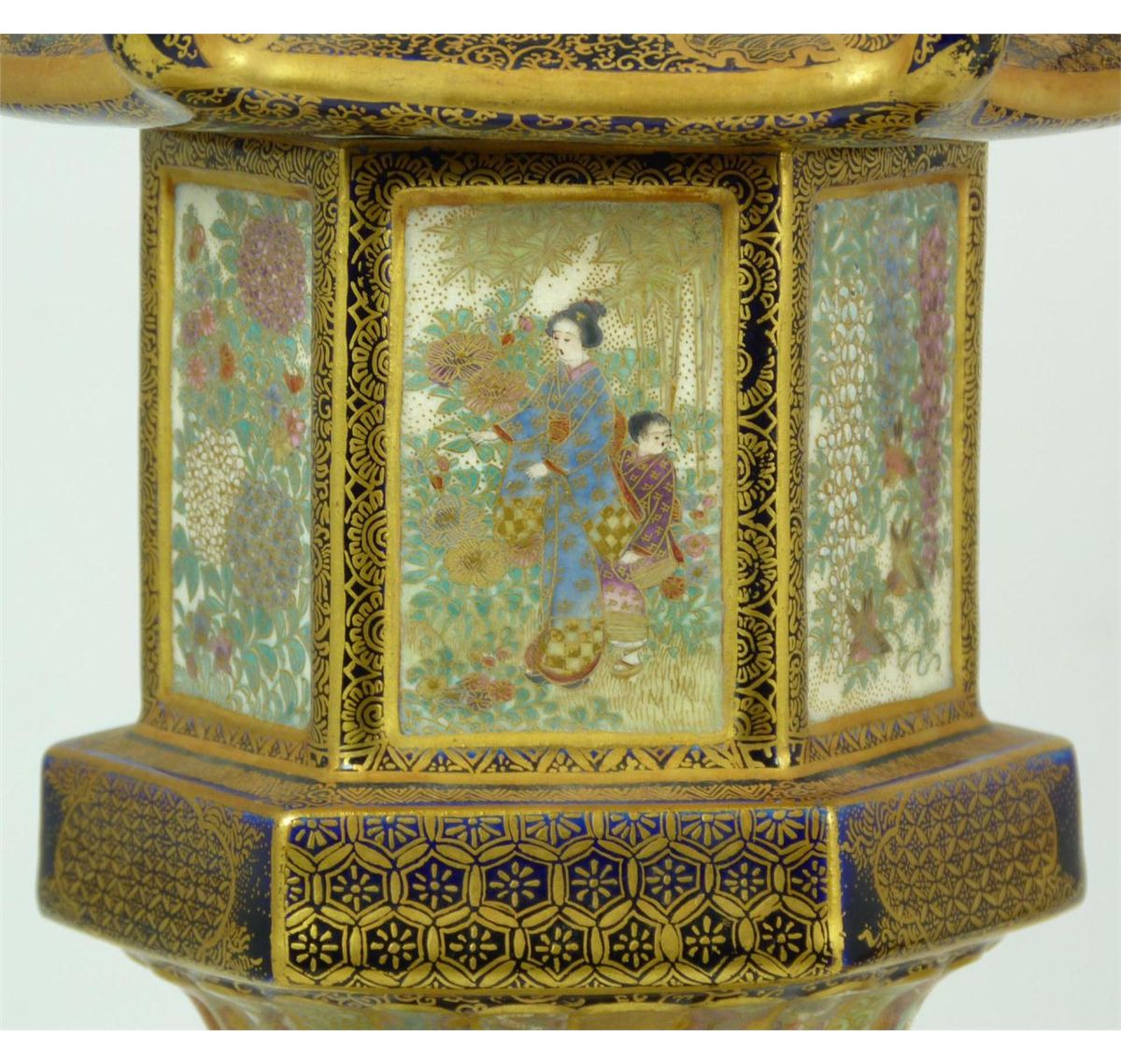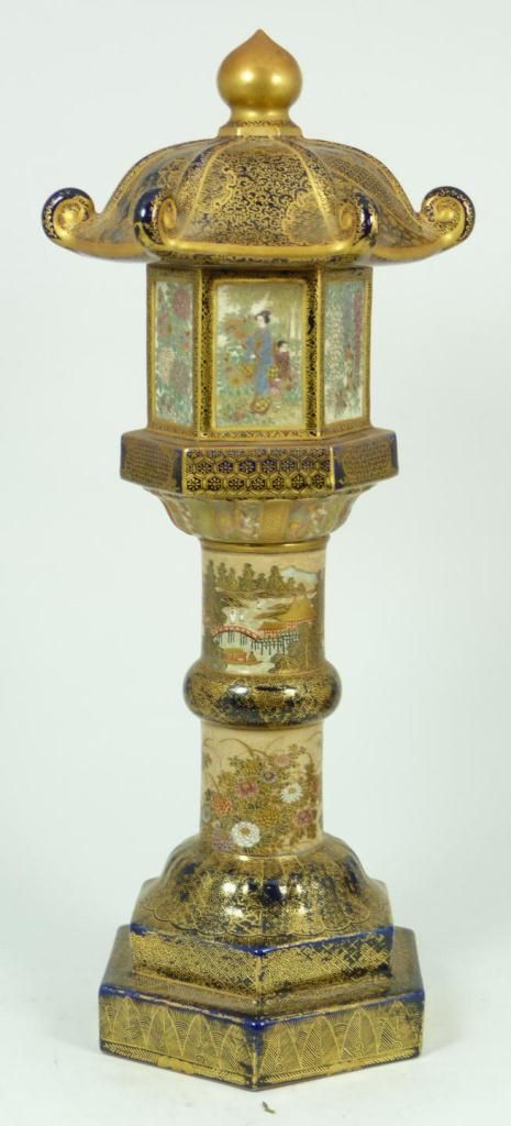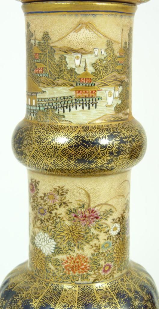 An antique Gosu blue Satsuma temple candlestick. Has gold and cobalt color scheme throughout with multicolor hand painted and enameled scenes of flowers, mountainous coast and maiden with child. Has three piece design with covered pagoda to top and candlestick holding it up. Late Edo to Meiji period. Measures 14 1/2" height (36.8cm). Total weight of 1766 grams.
