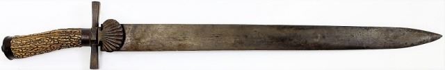19th C. German hunting cutlassmarked on cross guard but unreadable, 19" blade, stag handle, iron cross guard, clam shell and pommel cap. Good condition, blade show brown patina some light scattered pinprick pitting and light nicks to sharpened edge. Est. 200-400