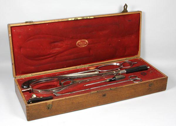 19th Century, Graillot Paris, veterinary instruments in mahogany box, 5" h. x 29" l. x 10 1/2" (box). One instrument missing, box imperfections.