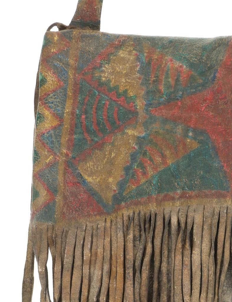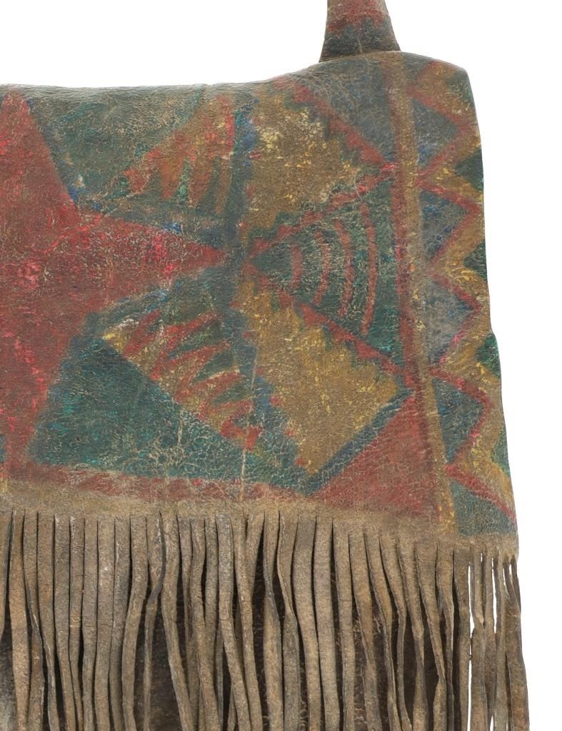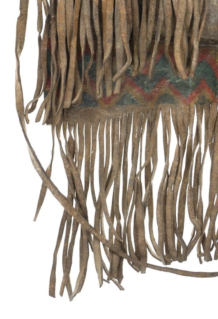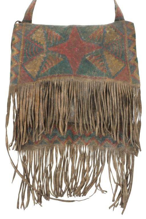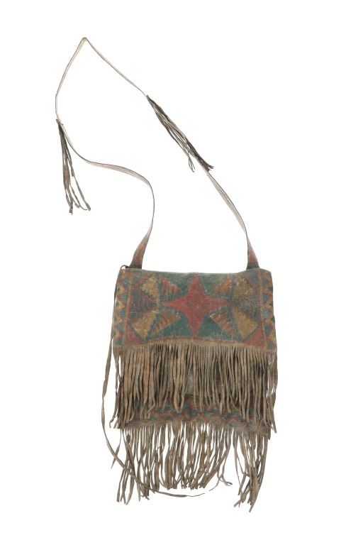 This is an unusual polychrome painted parfleche shoulder or bandolier bag dating to the 19th Century attributed to the Great Lakes Woodland region Native Americans from the ex-Donald Spaulding collection. The bag exhibits a thick parfleche rawhide with dark coloring being sinew sewn along with some hide lacing and covered on the front flap, straps and bottom fringe section with polychrome mineral pigment paint artwork. The front shows a classic four-point star, some times referred to by the Plains Indians as the morning star / Morningstar. For another Great Lakes region parfleche piece with morning star like designs see the Meskwaki (Fox) parfleche trunk from the Milford G Chandler collection in the Smithsonian National Museum of the American Indian; the piece shows a distinct four-point star bordering the outsides and bottom with similar dark parfleche hide. This example is very unusual as it has integral long cut fringes as part of the parfleche top flap, not completely unseen on Native American parfleche bags (see the Sioux 1860 Parfleche Painted Case sold by Heritage in 2017 for $2,800 and the Blackfeet Buffalo Parfleche Case sold by Hindman-Cowan’s in 2021 for $4,250). The top of the bag also has an unusual long strap or shoulder strap which also has polychrome mineral pigment paint on the front side up to the fringes. The bottom section has a sinew sewn section of long fringes which is also painted. The paint shows colors of red, blues and yellows. The hides are stiff, such as other parfleche rawhide, and do not show much major signs of cracking. A few of the fringes have fallen or broken off. The top flap can be opened but is very stiff. For another example see the Sauk and Meskwaki or Sac and Fox painted parfleche 1840 case with dark coloring and similar geometric designs sold by Bonhams in October 2022 for $10,000, noted as having a dark coloring due to smoke discoloration. Provenance: From the ex-collection of Donald Spaulding (1926-2021) noted New York artist known for his depictions of the American West, Native Americans and his illustrations of the Lone Ranger. Previously valued at over $9,500. Measures 39”H x 12”W.*