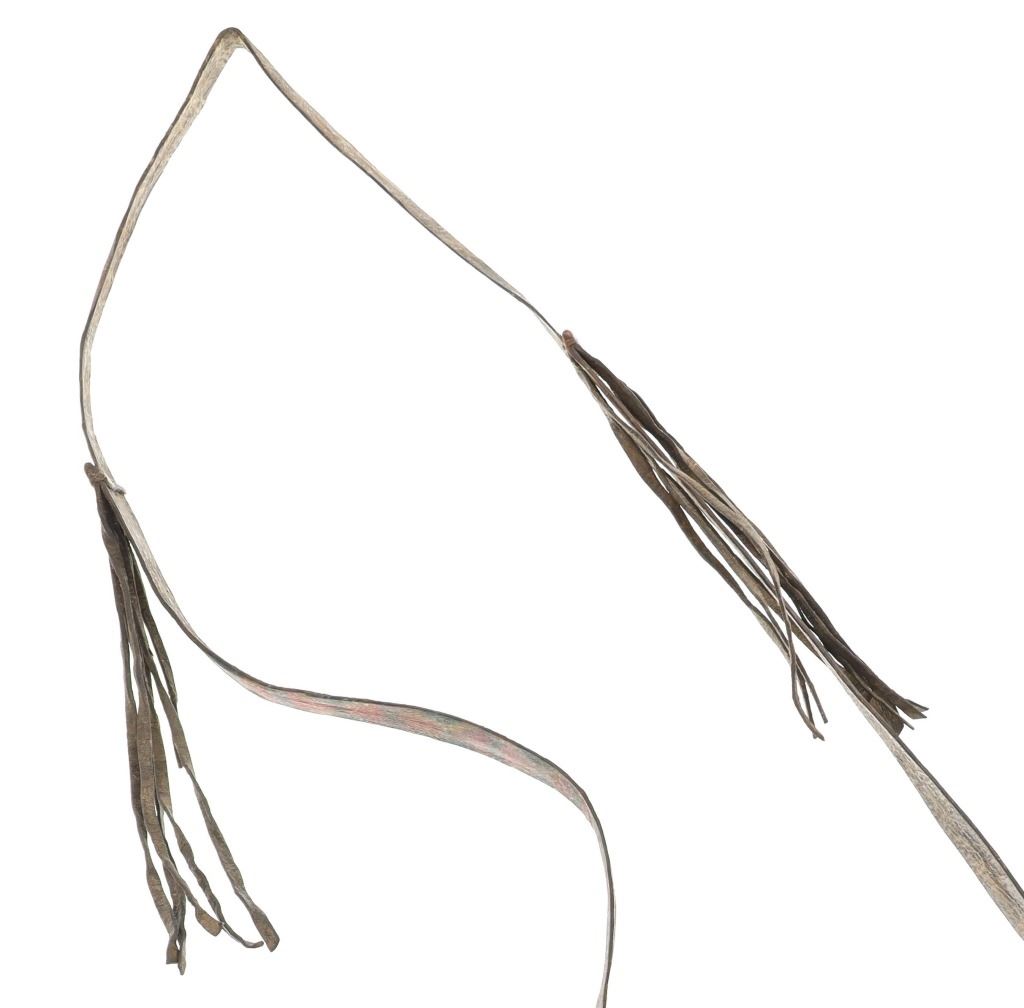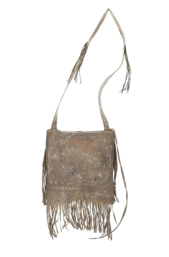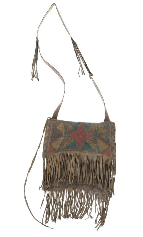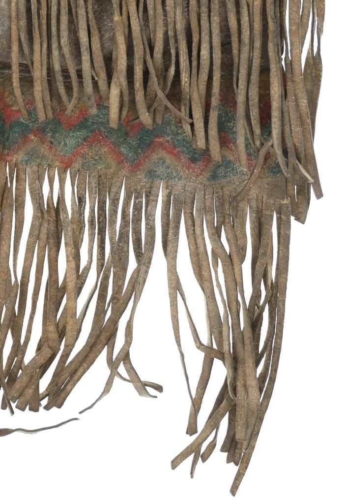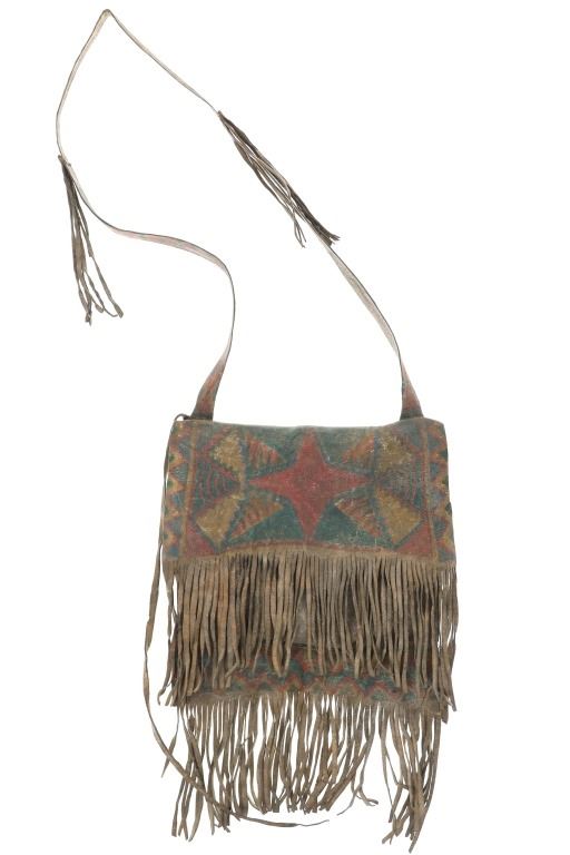 This is an unusual polychrome painted parfleche shoulder or bandolier bag dating to the 19th Century attributed to the Great Lakes Woodland region Native Americans from the ex-Donald Spaulding collection. The bag exhibits a thick parfleche rawhide with dark coloring being sinew sewn along with some hide lacing and covered on the front flap, straps and bottom fringe section with polychrome mineral pigment paint artwork. The front shows a classic four-point star, some times referred to by the Plains Indians as the morning star / Morningstar. For another Great Lakes region parfleche piece with morning star like designs see the Meskwaki (Fox) parfleche trunk from the Milford G Chandler collection in the Smithsonian National Museum of the American Indian; the piece shows a distinct four-point star bordering the outsides and bottom with similar dark parfleche hide. This example is very unusual as it has integral long cut fringes as part of the parfleche top flap, not completely unseen on Native American parfleche bags (see the Sioux 1860 Parfleche Painted Case sold by Heritage in 2017 for $2,800 and the Blackfeet Buffalo Parfleche Case sold by Hindman-Cowan’s in 2021 for $4,250). The top of the bag also has an unusual long strap or shoulder strap which also has polychrome mineral pigment paint on the front side up to the fringes. The bottom section has a sinew sewn section of long fringes which is also painted. The paint shows colors of red, blues and yellows. The hides are stiff, such as other parfleche rawhide, and do not show much major signs of cracking. A few of the fringes have fallen or broken off. The top flap can be opened but is very stiff. For another example see the Sauk and Meskwaki or Sac and Fox painted parfleche 1840 case with dark coloring and similar geometric designs sold by Bonhams in October 2022 for $10,000, noted as having a dark coloring due to smoke discoloration. Provenance: From the ex-collection of Donald Spaulding (1926-2021) noted New York artist known for his depictions of the American West, Native Americans and his illustrations of the Lone Ranger. Previously valued at over $9,500. Measures 39”H x 12”W.*