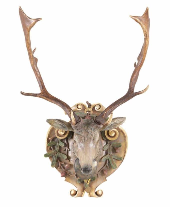 Featured in this lot is a Habsburg Fallow deer antlers on carved face from Eckartsau Castle, Austria, circa 19th century. A stunning and very life-like hand-carved linden wood Fallow deer with Italian polychrome painting technique with antique Habsburg antlers from the Eckartsau Castle of Emperor Franz Josef in the Southern Austrian Alps, a favorite hunting Schloss of the Habsburg family. Part of The European Hunt Collection, this grouping of antique hunting trophies from Royal and Noble families of Germany & Austria has been examined and appraised by James Supp of Coronado Trading Co., who is best known for his work. The condition of this carved Fallow deer on a shield is preserved with the pieces coming apart for transportation and storage as intended but otherwise shows a preserved condition. The measurements of this are 37 x 26" x 19 1/2". The collective weight of this Fallow deer mount is 21lb 10oz. Provenance: From a prominent ex-Bozeman private collection who purchased the majority of his collection from Cowan's, Skinner, Bonham's, Morphy's, Sotheby's, March in Montana, North American Auction and other well revered auction houses. This exact piece previously sold at NAAC auction for $9,000 (w/bp).*