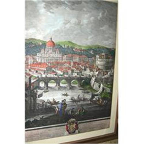 19th C. hand-colored etching of Rome. Etching: 24.5" x 35.25" plus matting. Wood frame is in fair condition, gold finish, damage in upper right hand frame face chip and lower center area 1.5" chip, minor scratches.