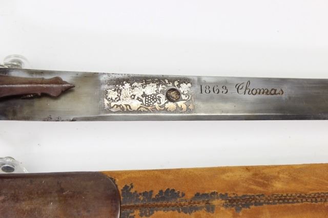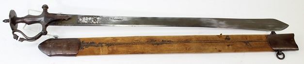 featuring 30" single edge blade dated 1863, iron disc hilt and cross guard, split knuckle guard, dragons head motif to the tips. Both sheath and sword in very good condition, NO repairs visible.