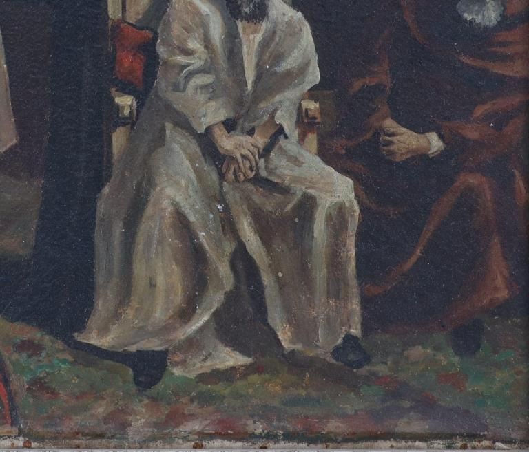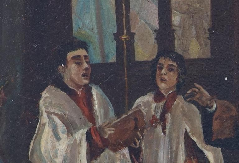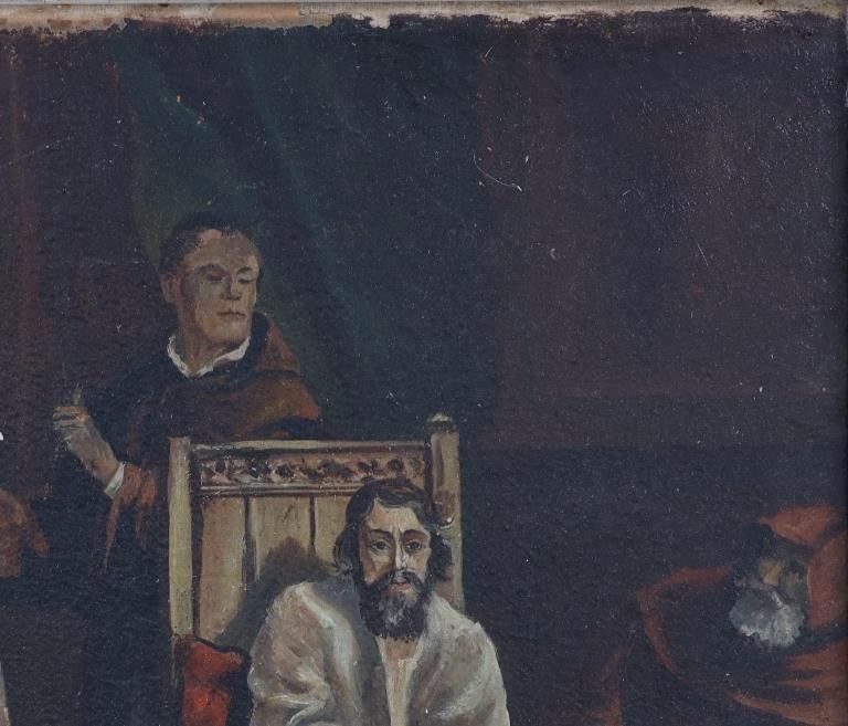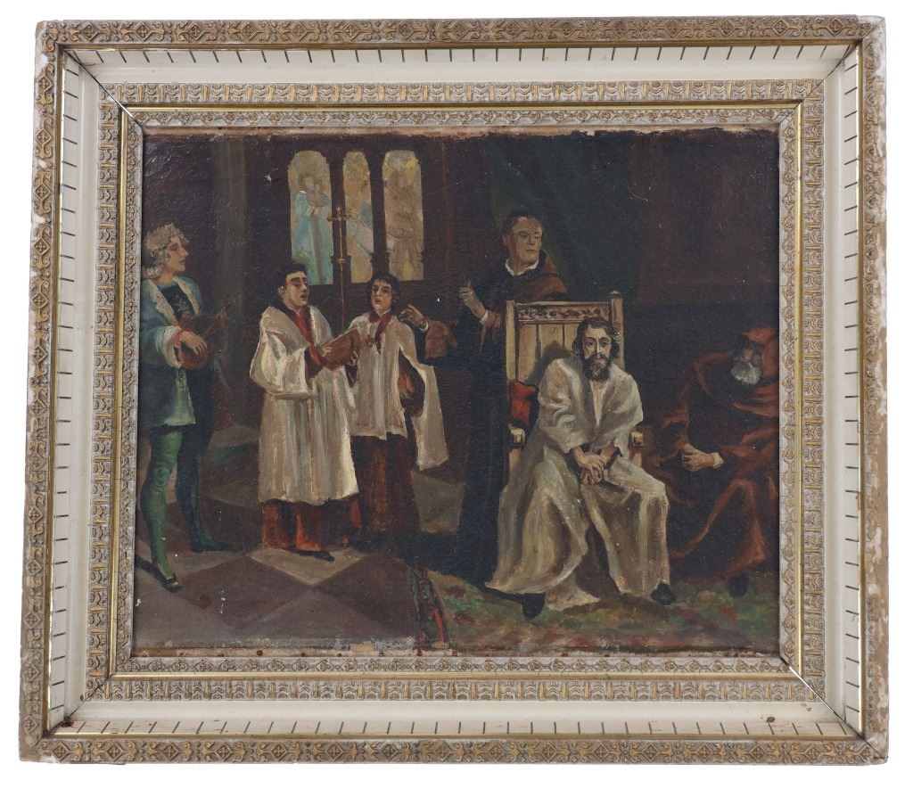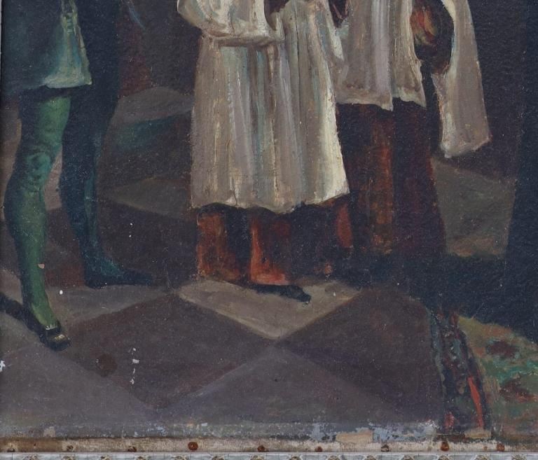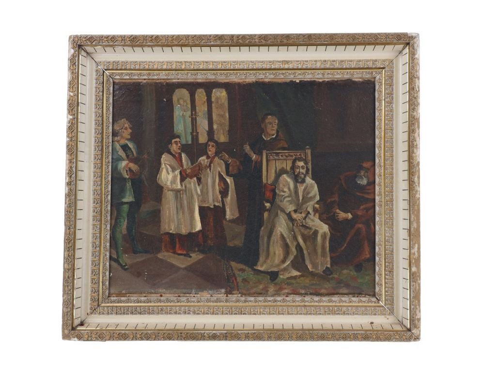 Featured in this lot is an original Italian school, "Catholic Mass" oil painting circa 1800s. The painting features a wonderfully and professionally crafted oil on canvas. The painting features a Catholic Mass with choir boys and a man playing a flute and two hooded priests in the background. The condition of this oil on canvas is fair to good with some wear to the edges of the painting. There are some stains to the frame, but otherwise it shows good overall condition. The measurements of this framed oil painting are 25 3/4" x 30" and the visible artwork measures 19 1/2" x 23 1/2".*