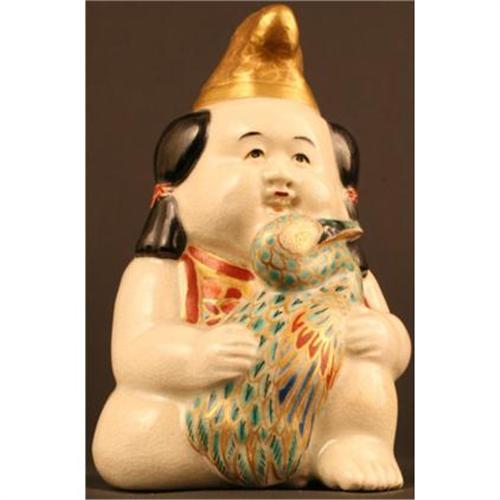 Gosho Ningyo (Palace Doll) holding a Crane. Kintaro loved all birds and animals. This rare porcelain figure is signed by Makuzu, a well recognized porcelain artist who is collected by museums and collectors in Japan. He uses glazes in his own recognizable style. 4 inches, 10 cm tall. Excellent Condition. From a prominent and widely exhibited collection.