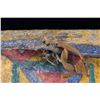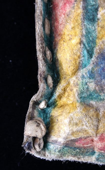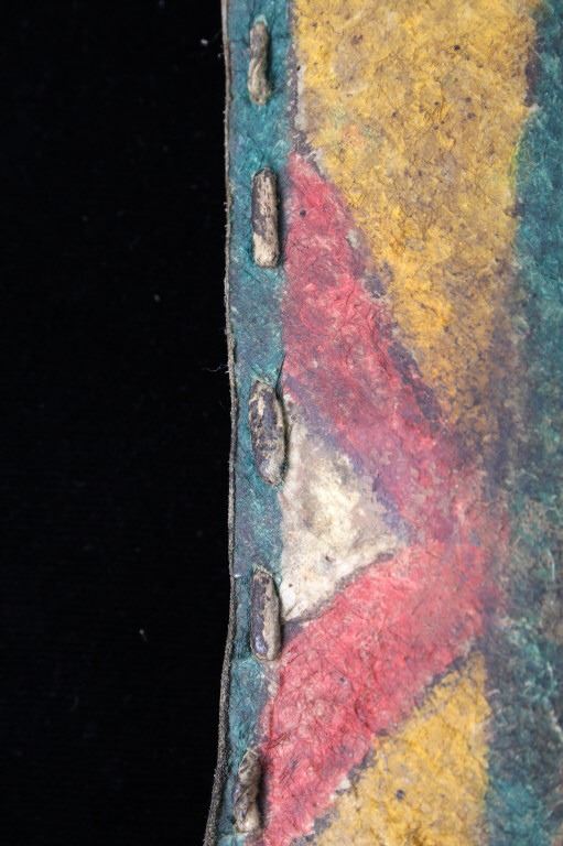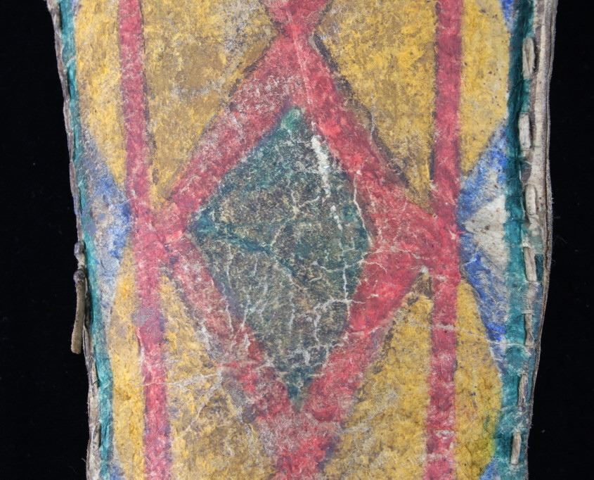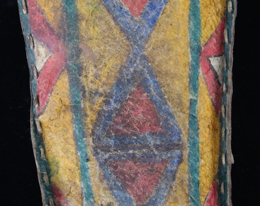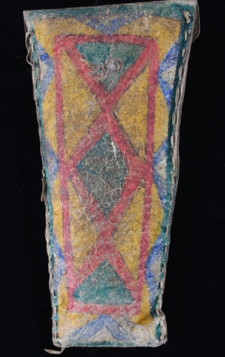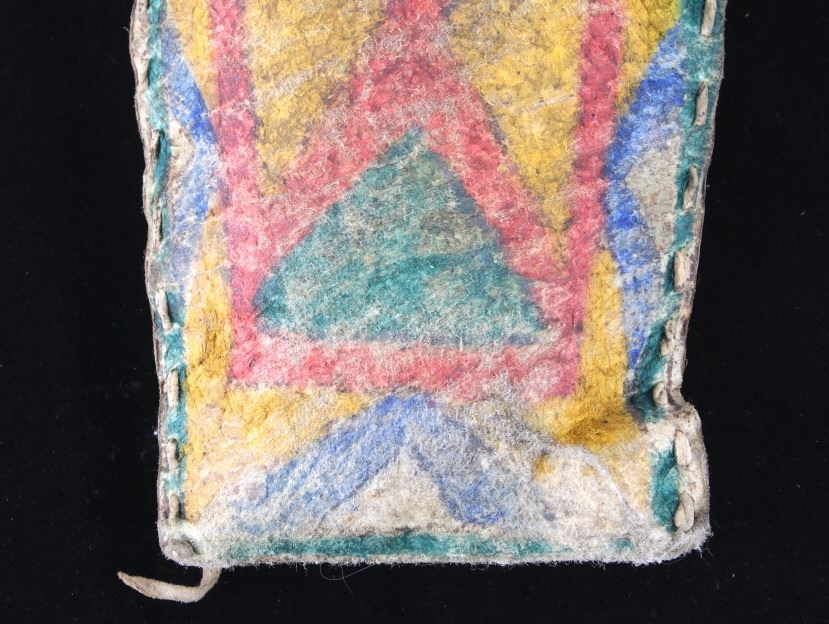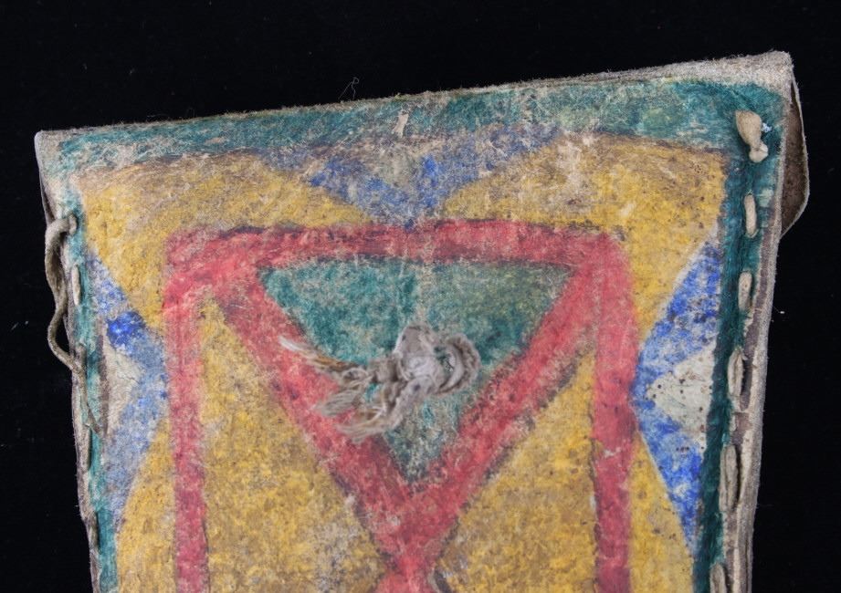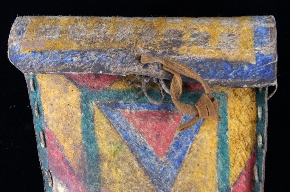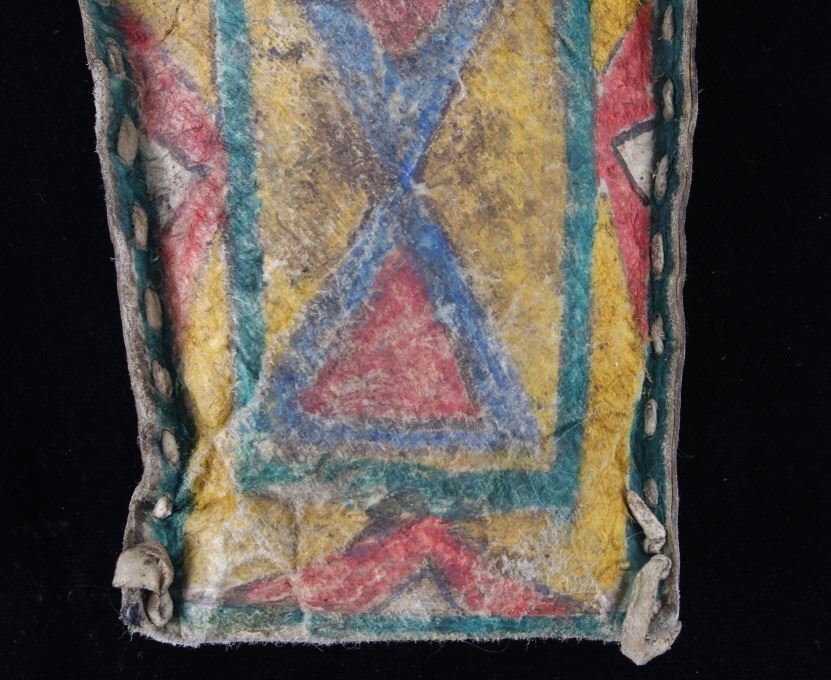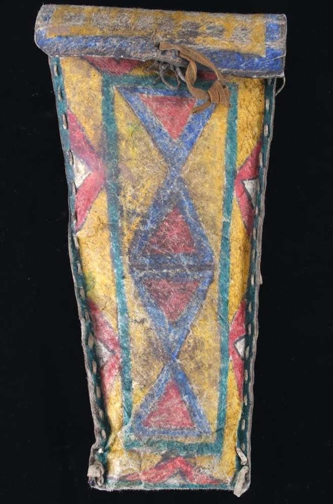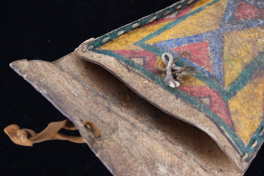 The lot features an excellent Lakota Sioux polychrome painted parfleche case from the 19th Century. The piece shows a fantastic geometric polychrome painted finish across the entiure outside and flap of the case. The case shows one piece of parfleche rawhide that is folded over and sewn with Indian tanned hide. The flap shows Indian hide and the back shows an old trade clothe tie. The inside of the case shows the hand scraping remnants. The piece dates to the circa 1860-1870's and is truly a work of art. The hide has some stiff and some soft spots with no major damage. Provenance: From the renowned Sundog Fine Art Bozeman, Montana collection by Bruce VanLandingham. Bruce VanLandingham was a pillar in the American Indian collecting community and a respected expert. Along with being an avid collector, Bruce was also the sole owner of Sundog Fine Art Gallery in Bozeman, which was both part museum and gallery, this piece is directly from the collection. The envelope, bag or case measures 11.25"L by 6"W. Museum collection number E1019.