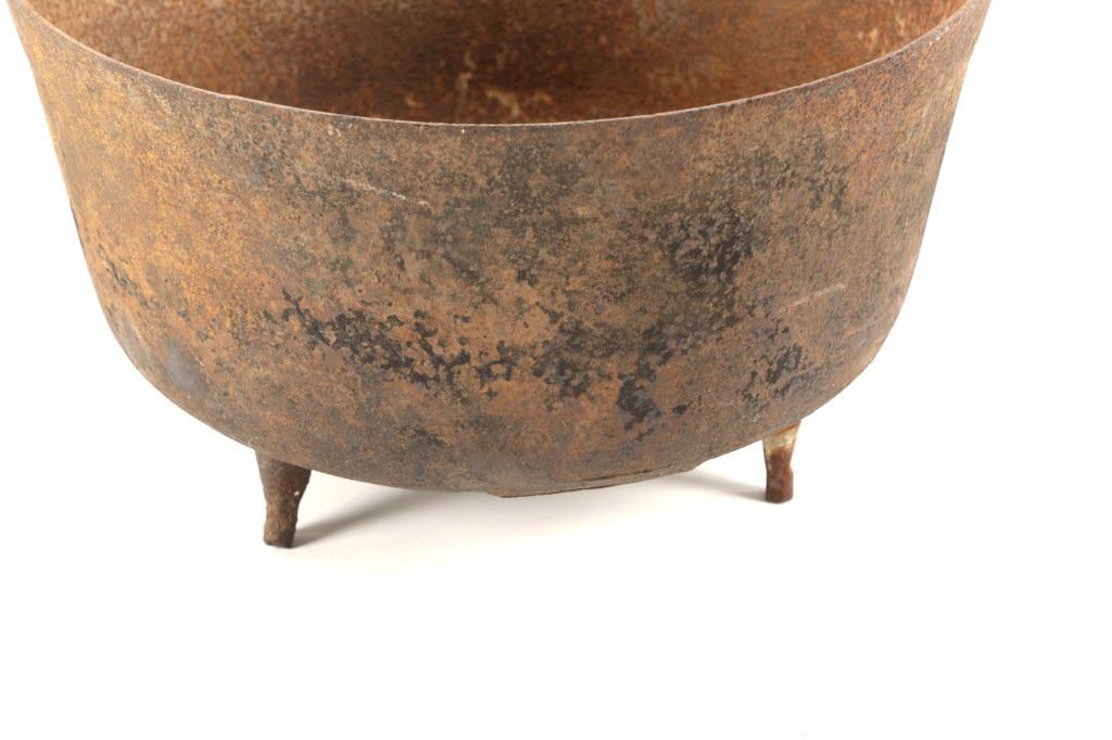 Featured in this lot is this 19th century cast iron scalding cauldron kettle. The kettle features a wonderfully and professionally crafted cast iron construction. It shows a swivel handle and shows three feet to this large cauldron. The condition of this cauldron is good with some oxidation consistent with its age but otherwise shows good overall condition. The measurements of this cauldron is 14 3/4" x 21 3/4" x 20 1/2".