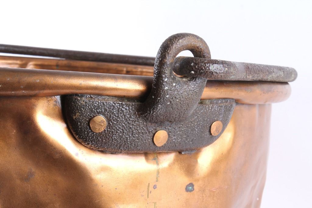 For your consideration is a 19th Century Large Scale Copper & Iron Pot. This 19th Century hammered copper confectionary pot is built with wrought iron mounts and a swinging handle, this is a large kettle and shows a rolled lip at the rim. The copper is constructed with dovetail joint design to hold the bodies of the kettle together. This pot is large and shows good with some dents and marks consistent with its age and use. It has a nice patina overall to both inside and outside of the kettle. This type of pot could serve many functions. It measures approximately 24" in diameter and 15.5" H.