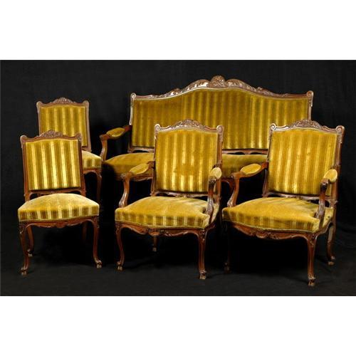 A 19th C. Louis XV St. set of one sofa, two chairs and two armchairs made of walnut. Possibility of splitting up the set.