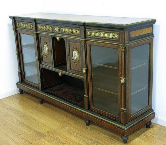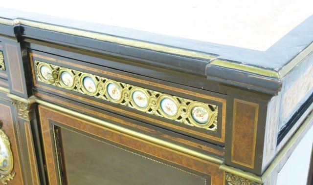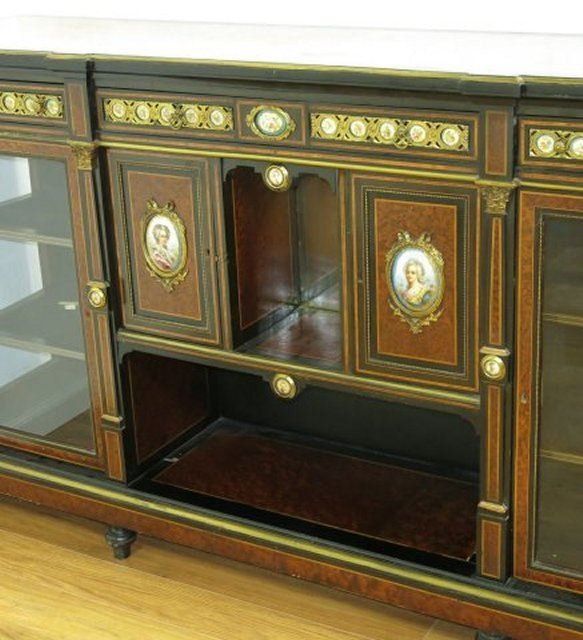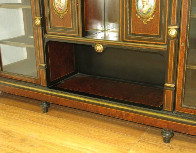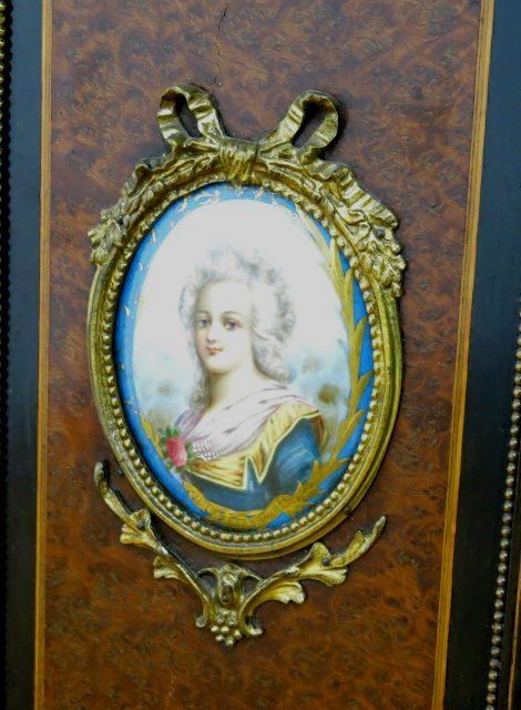 Bronze mounted with 32 porcelain plaques. Burled walnut, Chamford back. Approx. 6' W x 17" D x 41 3/4" H. Portrait plaques on doors missing molding trim on lower right side.
