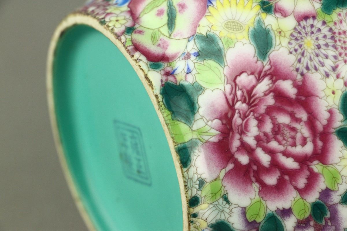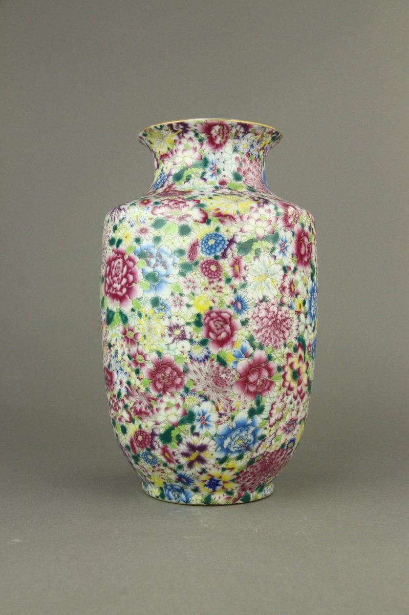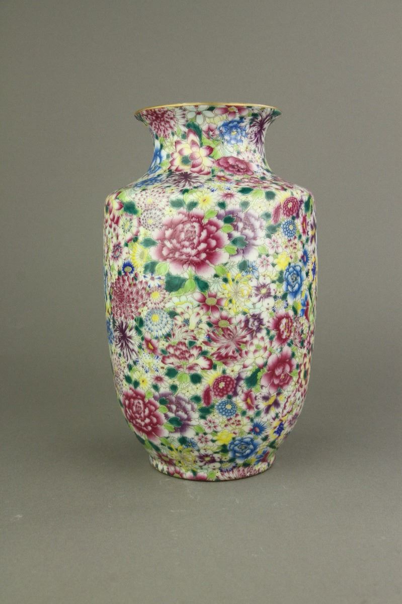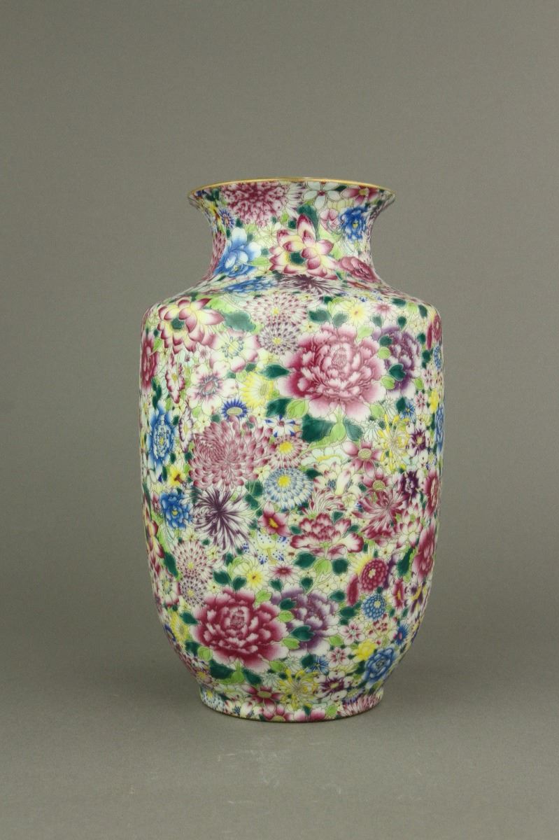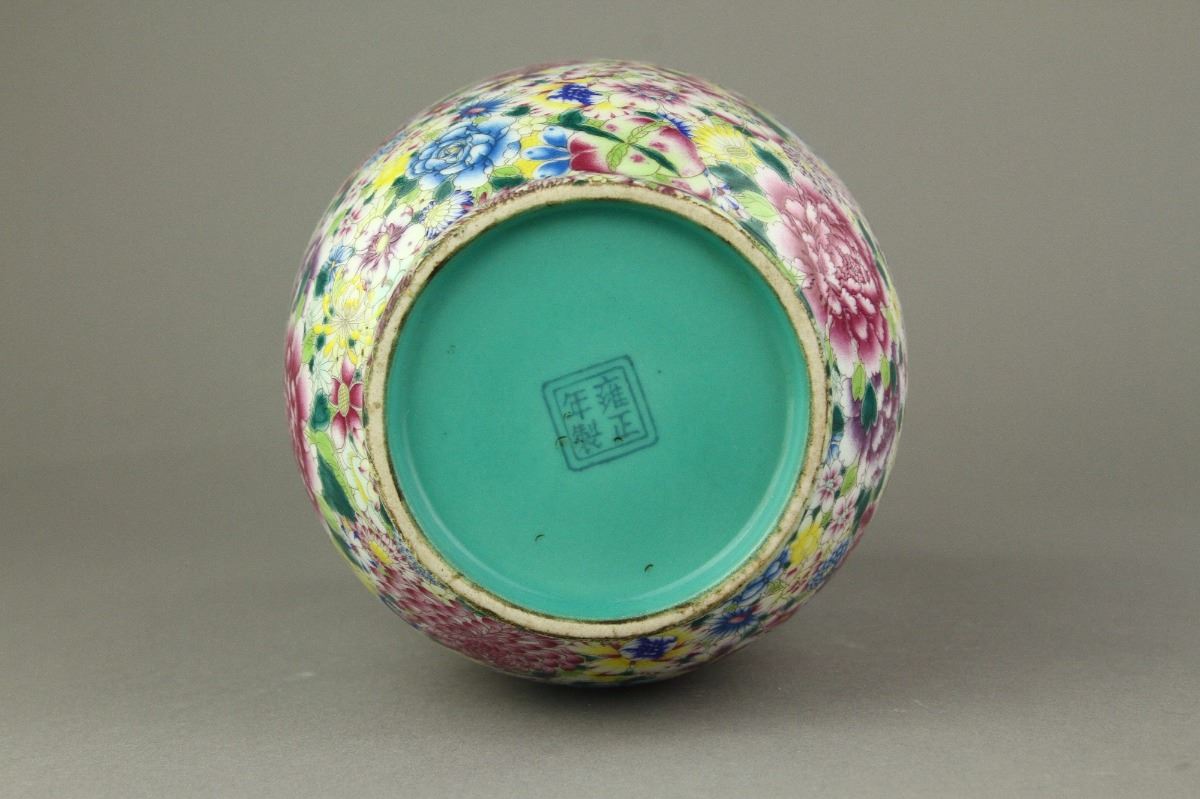 Chinese Famille Rose mille fleurs porcelain vase; 19th century; of ovoid body with short waisted neck; painted densely with a multitude of flowers including lotus, peony and chrysanthemum; four-character Yongzheng mark on base; H: 21 cm, D: 13 cm, 732 grams