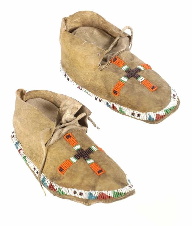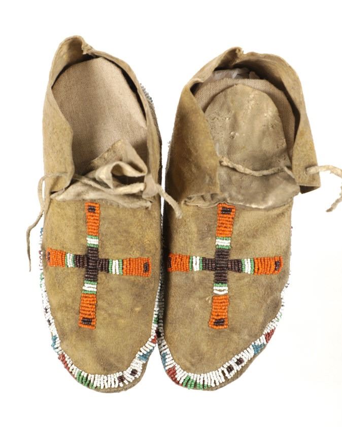 This is a fine set of 19th Century Indian hide and hard sole moccasins from the Crow Apsaalooke Indians of Montana. The set shows a classic medium height moccasin comprised of Indian tanned hide, likely Buffalo / Bison hide, sinew sewn with thick parfelche Buffalo / Bison hard sole bottoms with a nice foot worn pattern. The beadwork is cotton trade trade sewn with early glass trade seed beads in a pattern that has been documented and attributed to the Crow's of Montana. The beads include colors of greasy orange, lilac, chalk white, medium green, brown, and semi-transparent light blue. The sety has the original tongue and an Indina hide tie strap on both. The bases show some cracking, but are solid, the tops have some stiffening, but mostly supple. Little bead loss and well kept set that display beautifully with the bold Maltese cross pattern on the foot with border of beadwork at the base, which wraps around the entire foot. Utah collection. Each measures 9.5"L by 3 3/8"W by 3.75"H. Total weight of 6 oz.