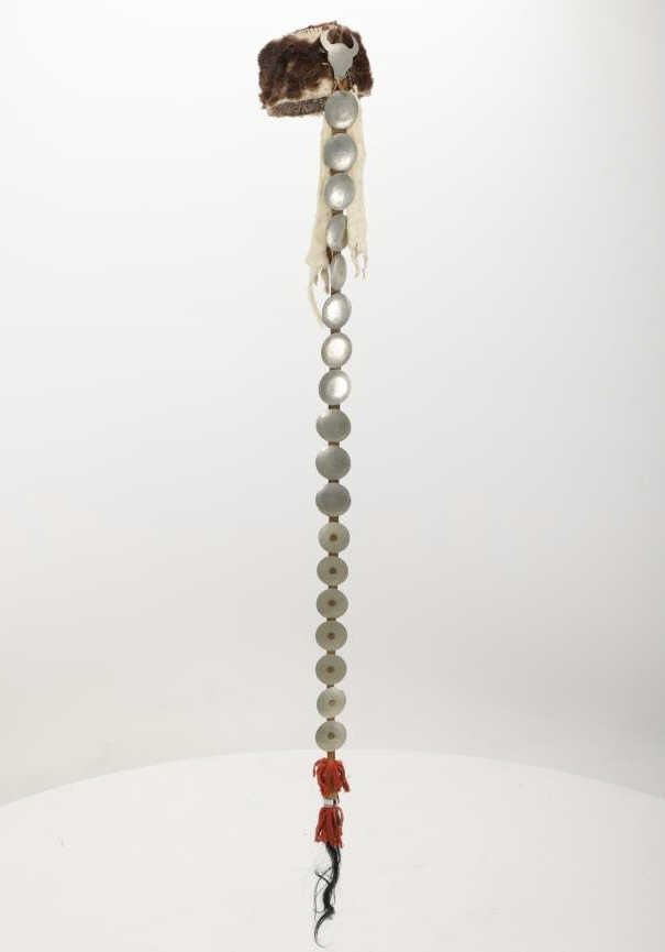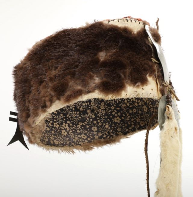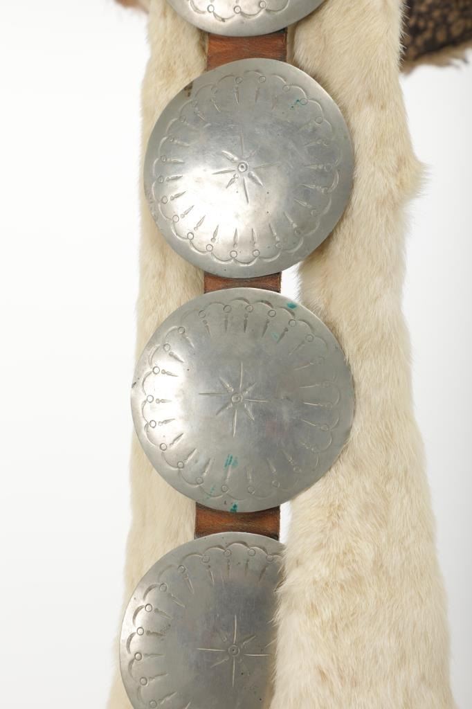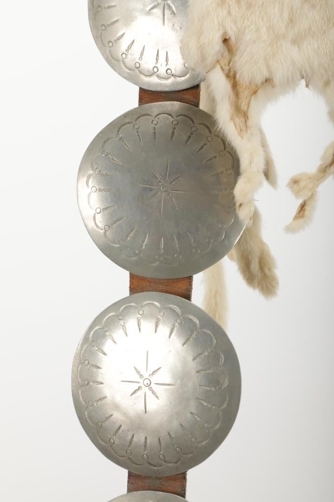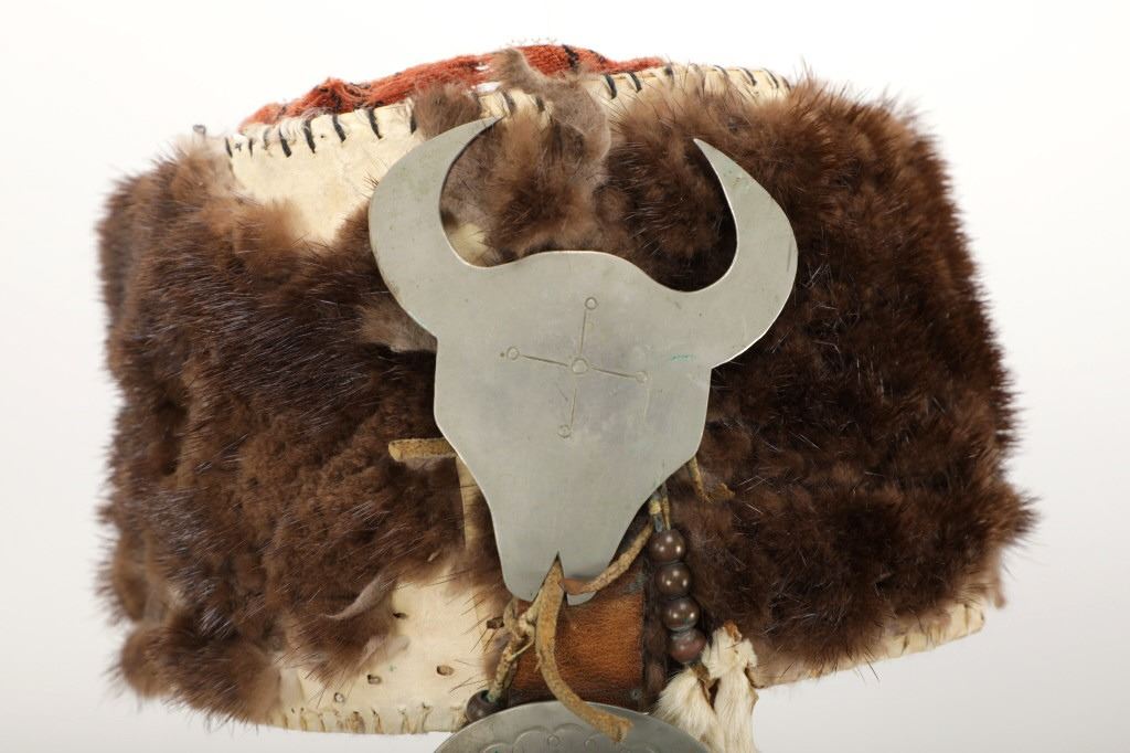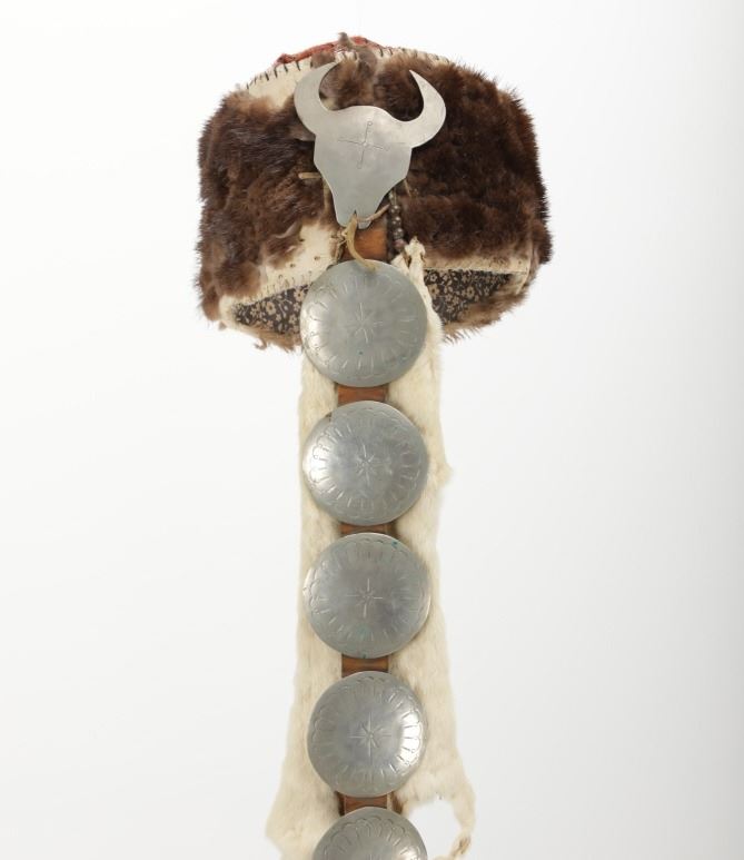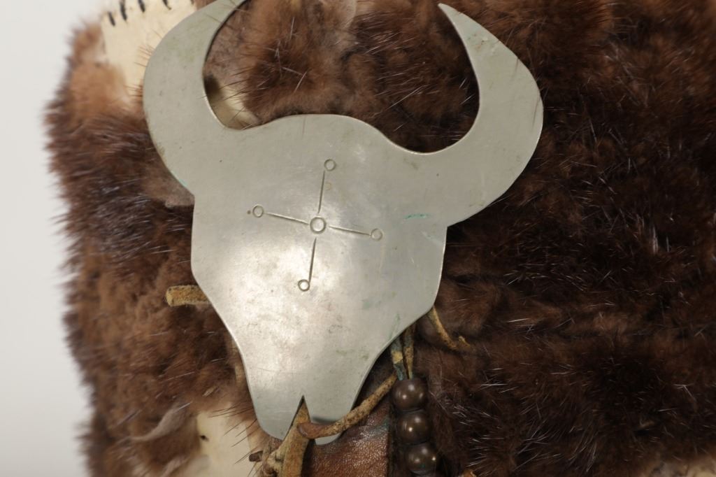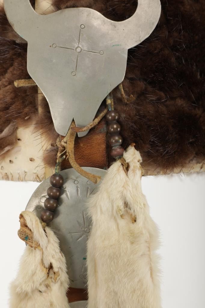 This is an outstanding 19th Century Northern Arapaho otter turban with silver concho drop from the ex-collection of Sherwoods Spirit of America Gallery in Santa Fe Mark Kokin. Early Indians from the the Omaha-Ponca Hethuska, Osage Inlonshka, Northern Arapaho, Kiowa, Prairie, amongst other tribes worn turban's of otter fur such as this, unlike the traditional war bonnet or headdresses of the Plains. Dr. James Howard summized "The otterskin hat, rather than the war bonnet, was the 'chief's' headdress, while a similar headdress of fox fur marked the experienced warrior." (Howard, 1965, p. 66). “The peculiar headgear shown in plates 36 and 49 (otter fur turbans), was worn only by chiefs; it bore the name watha’ge, which was applied to all caps which fit the head.” (Fletcher & LaFlesche, 1911, p. 354). These original otter turban's are incredibly scarce with this being an example from the Northern Arapaho dating to the 1800's. This example shows a parfleche rawhide band of otterskin / otter skin with otter fur on the outside sewn to calico floral trade clothe and trade clothe canvas inner linning which holds a stiff backing, possibly a later addition, and along the top is a band of red stroud wool trade clothe with a fancy beaded edge at the top in period correct glass trade seed beads chalk white showing mainly trade thread sewing. The back of the turban shows a unique piece of nickel silver showing a modified cross of loraine with head at the top and split tail bottom. The front shows a nickel silver Buffalo Bison skull shape with four-point line and circle design stamped at the front with Indian tanned tied on fringes with solid brass trade beads and long ermine skins and lastly tied on the long drop of harness saddle trade leather. The long piece of harness saddle leather has rows of original nickel silver large conchos / conchas, first a row totaling eleven being approximatley 2 7/8" in diameter having a stamped pattern on each and nickel silver slide on back. At the end of the leather strip tied on is another added leather strip which holds seven other conchos / conchas having a nickel silver body with simple stamped patternwith drilled hole at the center having a round copper button which has a loop on the bottom and is tied onto Indian tanned hide. At the bottom of this section is tied on a drop which consist of a trade clothe canvas core having a wrapping of Indian tanned hide with glass trade seed bead beadwork with fringe strips of red stroud trade clothe at teh top and bottom as well as tied on the bottom a strip of rawhide from the end of a horse tail with long horse tail hair. The last seven conchos and horsetail hair drop is likely a later old addition. Provenance: From the collection of Sherwoods Spirit of America Santa Fe, New Mexico Mark Kokin, an ex-collection of Oklahoma and a private collection from outside Milwaukee, Wisconsin. Original Turban bonnets such as this are exceedingly rare with examples holding original nickel concho drops being even more scarce. For reference see the Kiowa Hair Roach and Trade Clothe Drop sold by Skinner Bonhams in 2013 for nearly $10,000, the Prairie Otter fur turban with german silver broach circa 1880. Truly a sale highlight. The piece overall measures 77 inches in total length. The turban is 5 inches wide at the band by approximately 24.75" circumference around the outside. The piece has a custom plexiglass plastic frame for mounting on the wall (with break). Included is the image from Sherwoods Spirit of America Santa Fe, New Mexico Mark Kokin, stand not included.